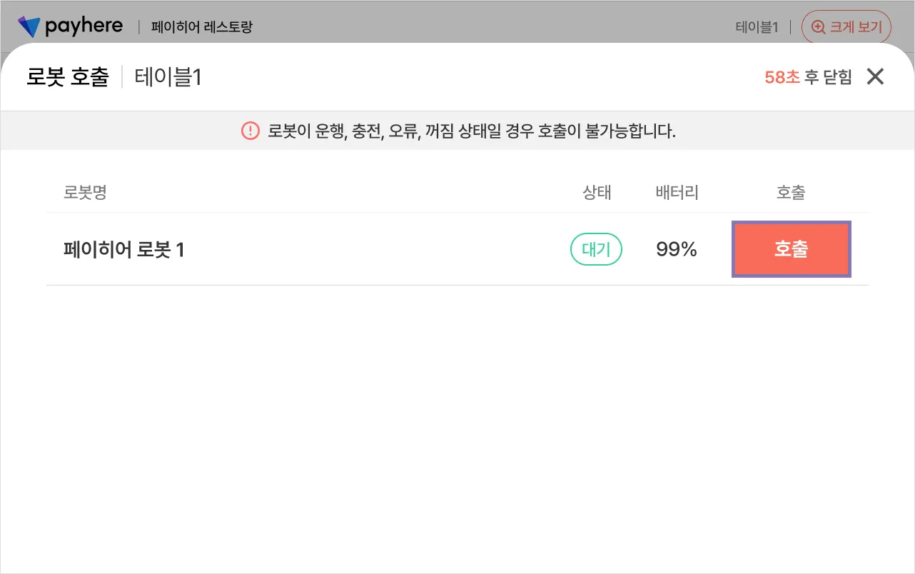 서빙 로봇의 상태에 따라 호출 가능 여부가 다릅니다.