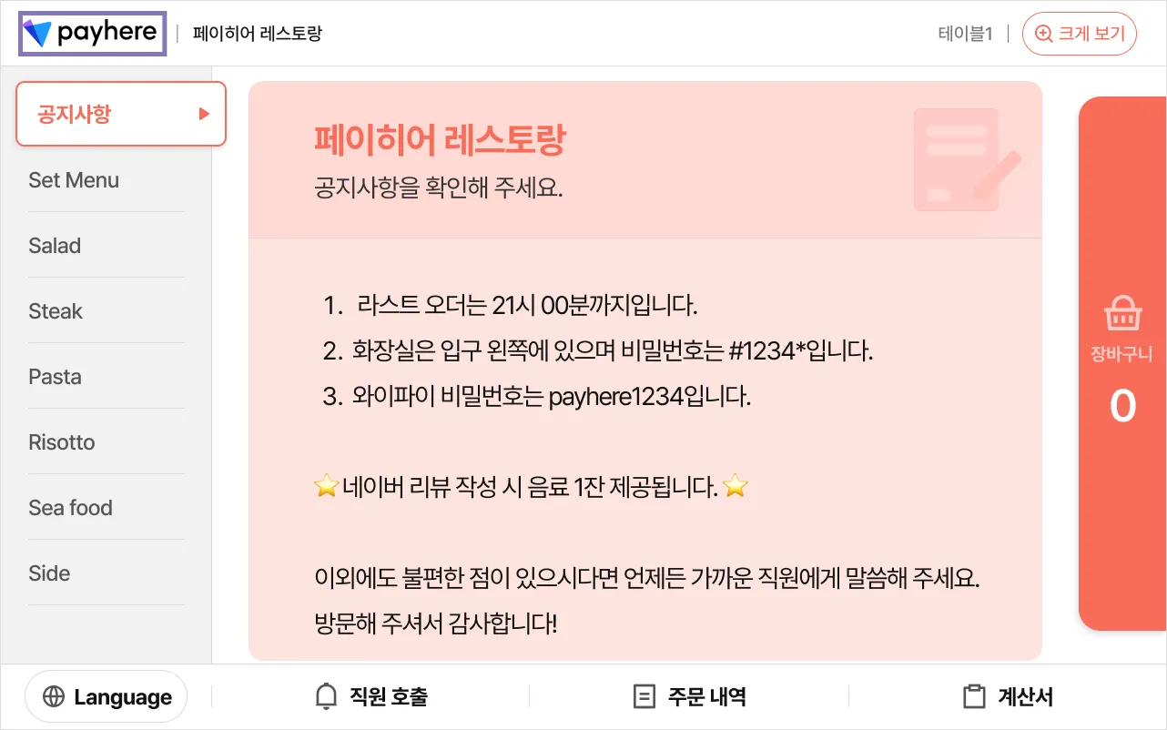 1) 테이블 오더 홈 화면에서 왼쪽 상단에 있는 페이히어 로고를 5번 연속으로 터치합니다.