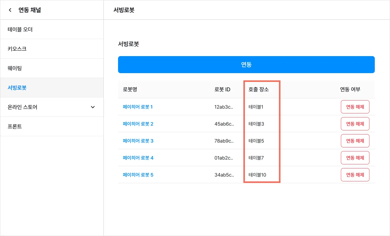 호출 장소는 [더보기] → [설정] → [연동 채널] → [서빙 로봇]에서 설정이 가능합니다.