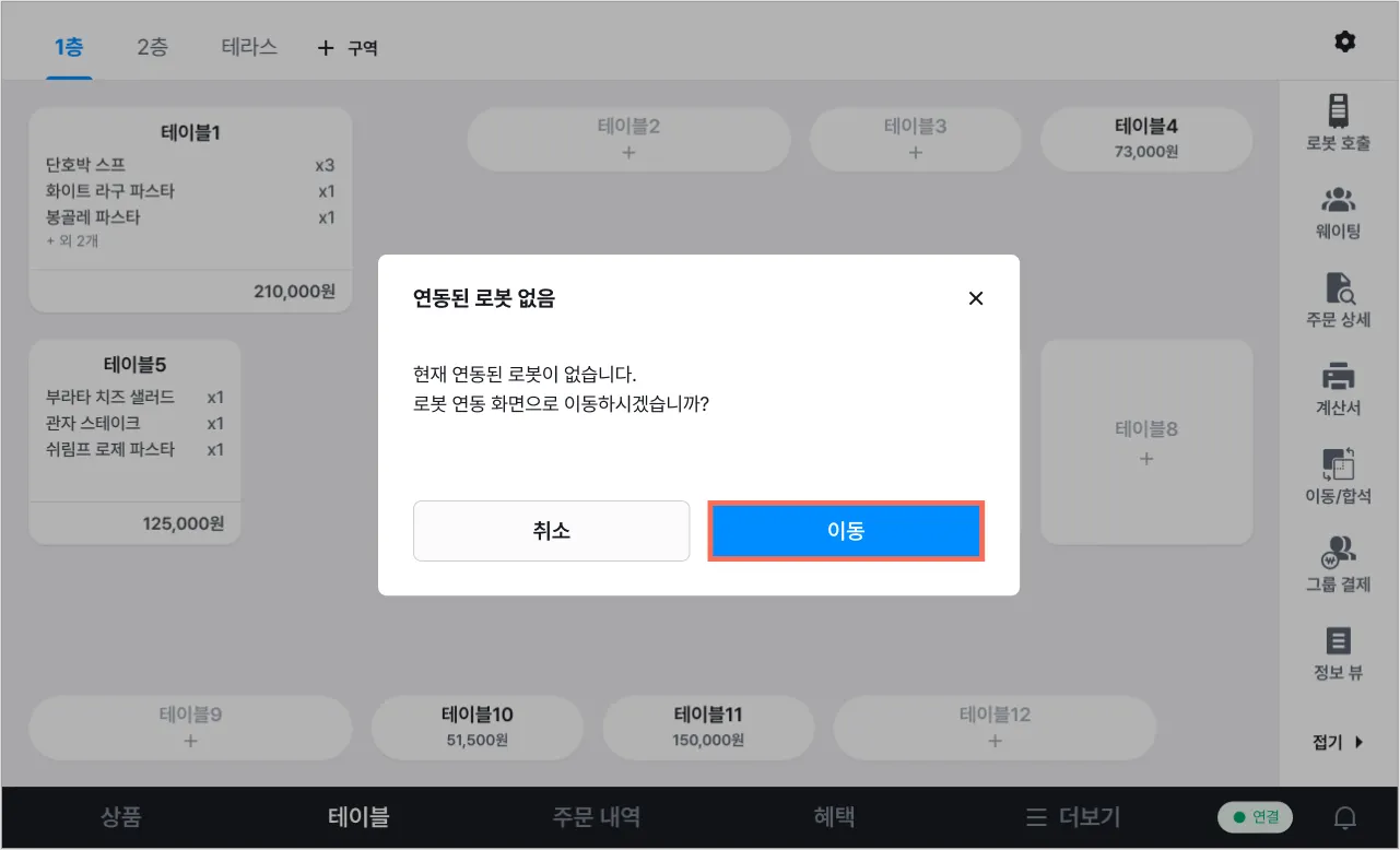 서빙 로봇이 연동된 테이블 오더에서만 로봇 호출 화면이 나타납니다.