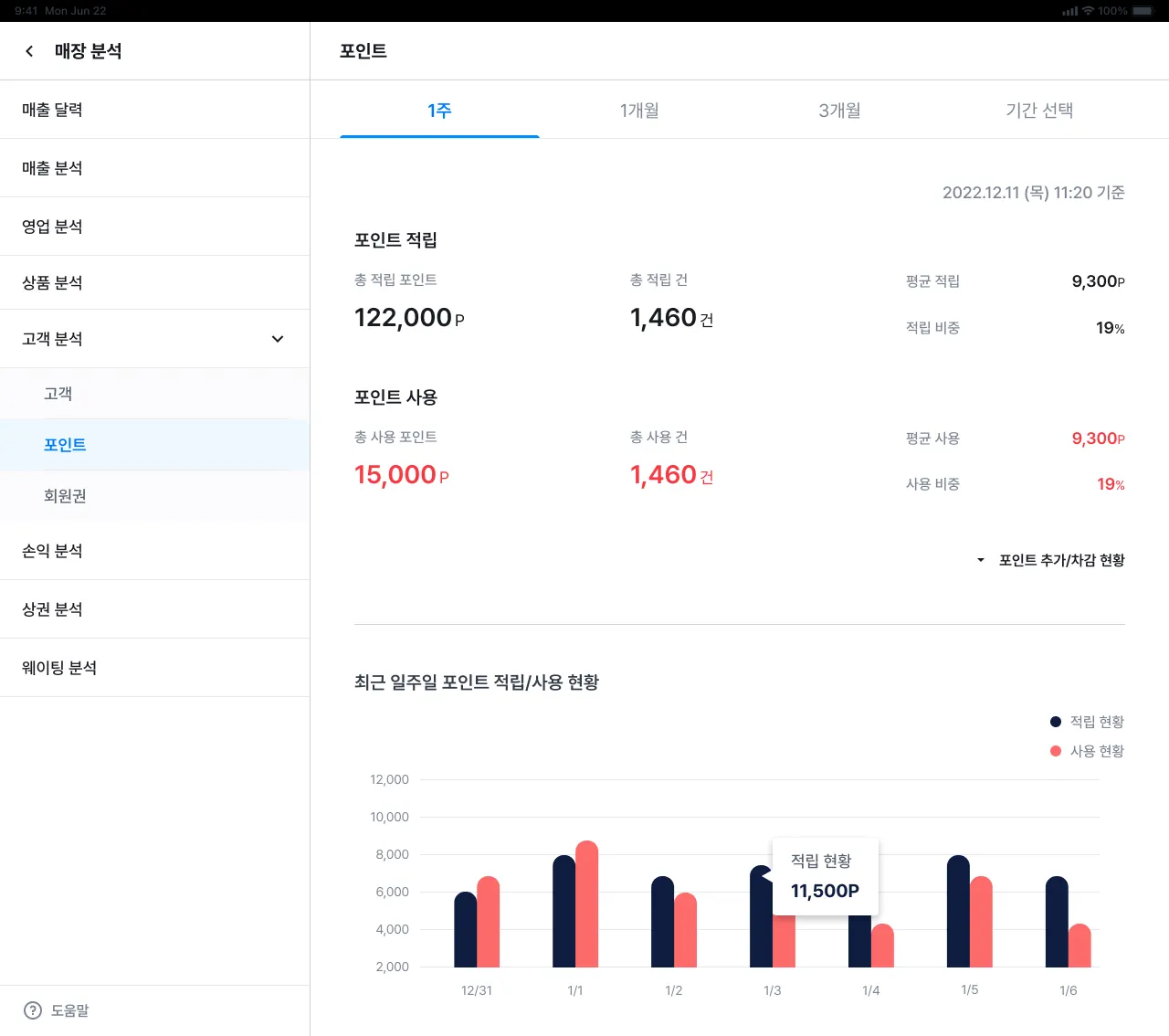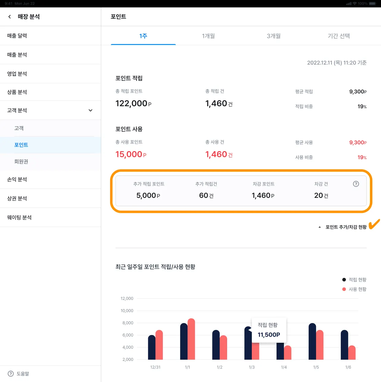 [고객 분석] → [포인트] 메뉴를 누르고 기간 선택탭을 눌러 기간을 설정 후 조회할 수 있습니다.