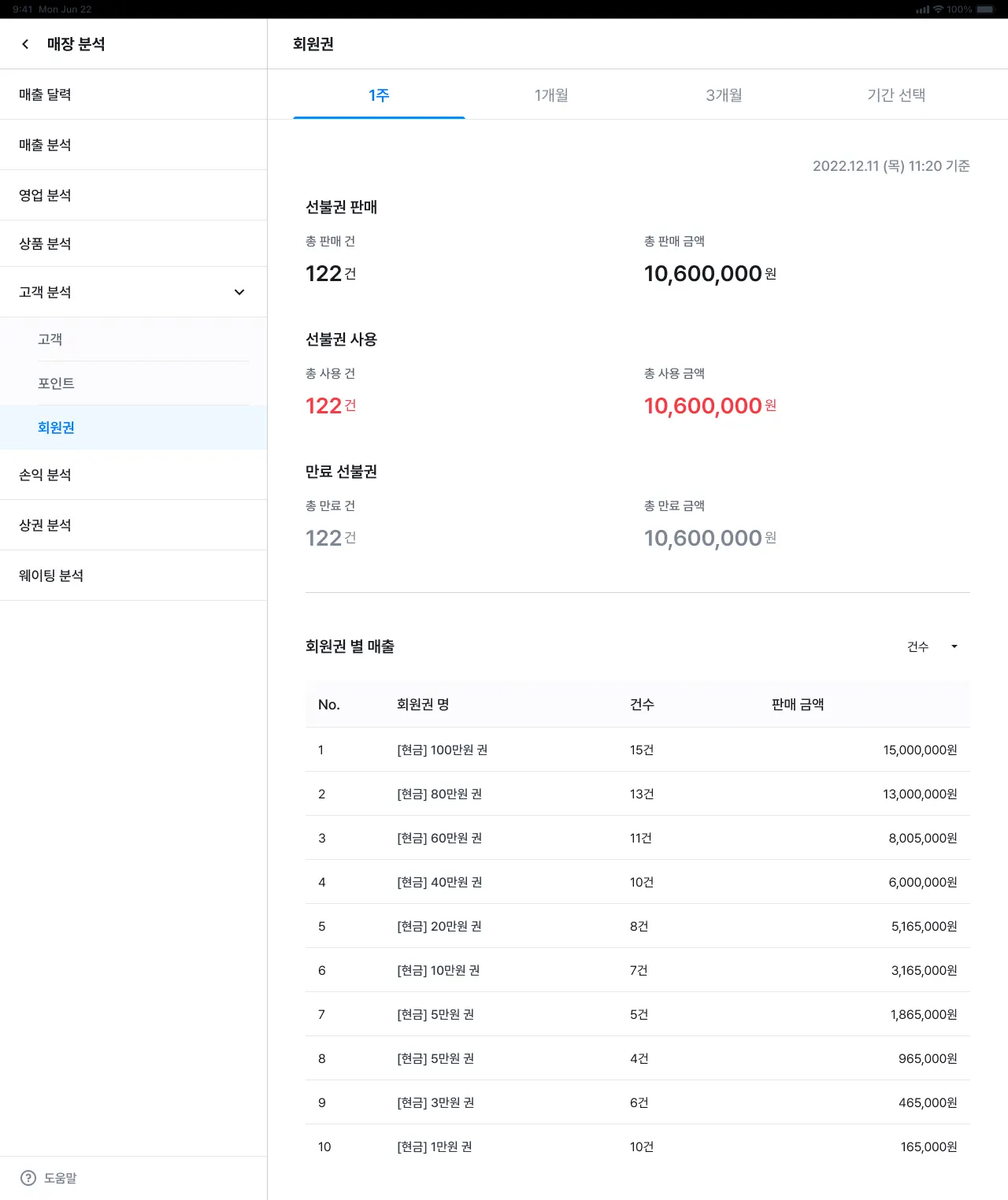 기간별 선불권 판매, 선불권 사용, 만료 선불권, 회원권 별 매출 확인이 가능합니다.