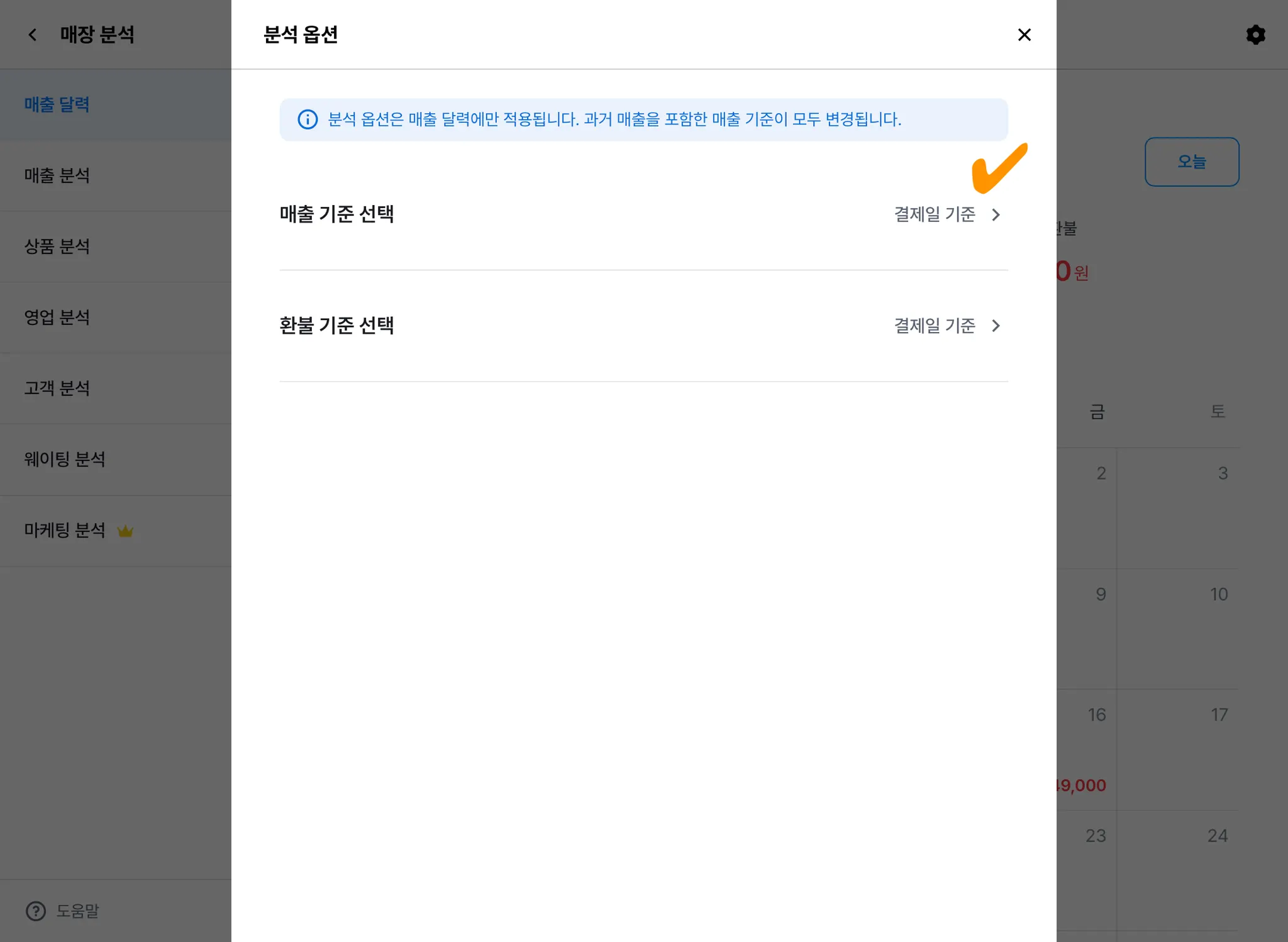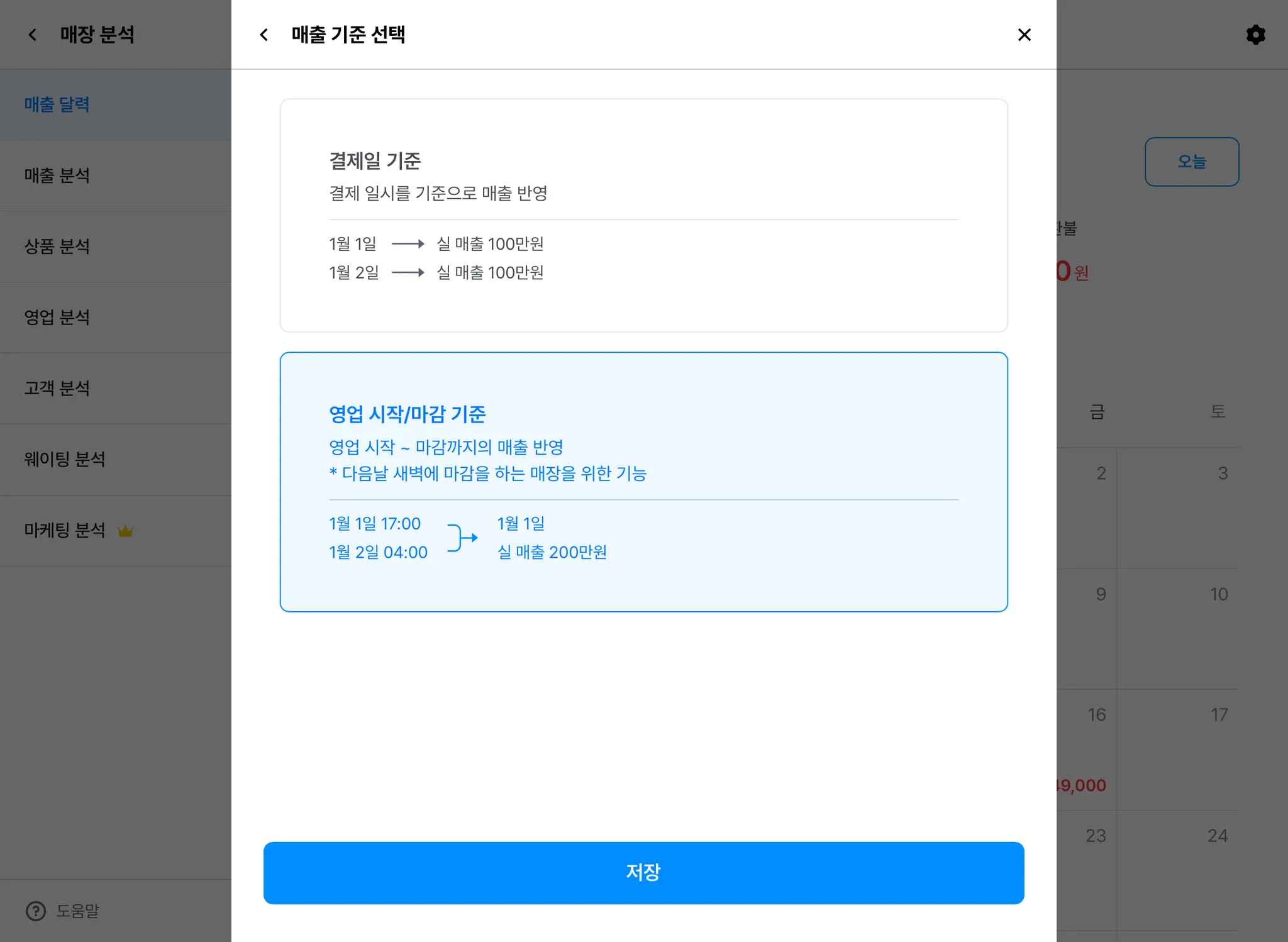 2) 매출 기준을 [영업 시작/마감 기준]으로 설정해주세요.