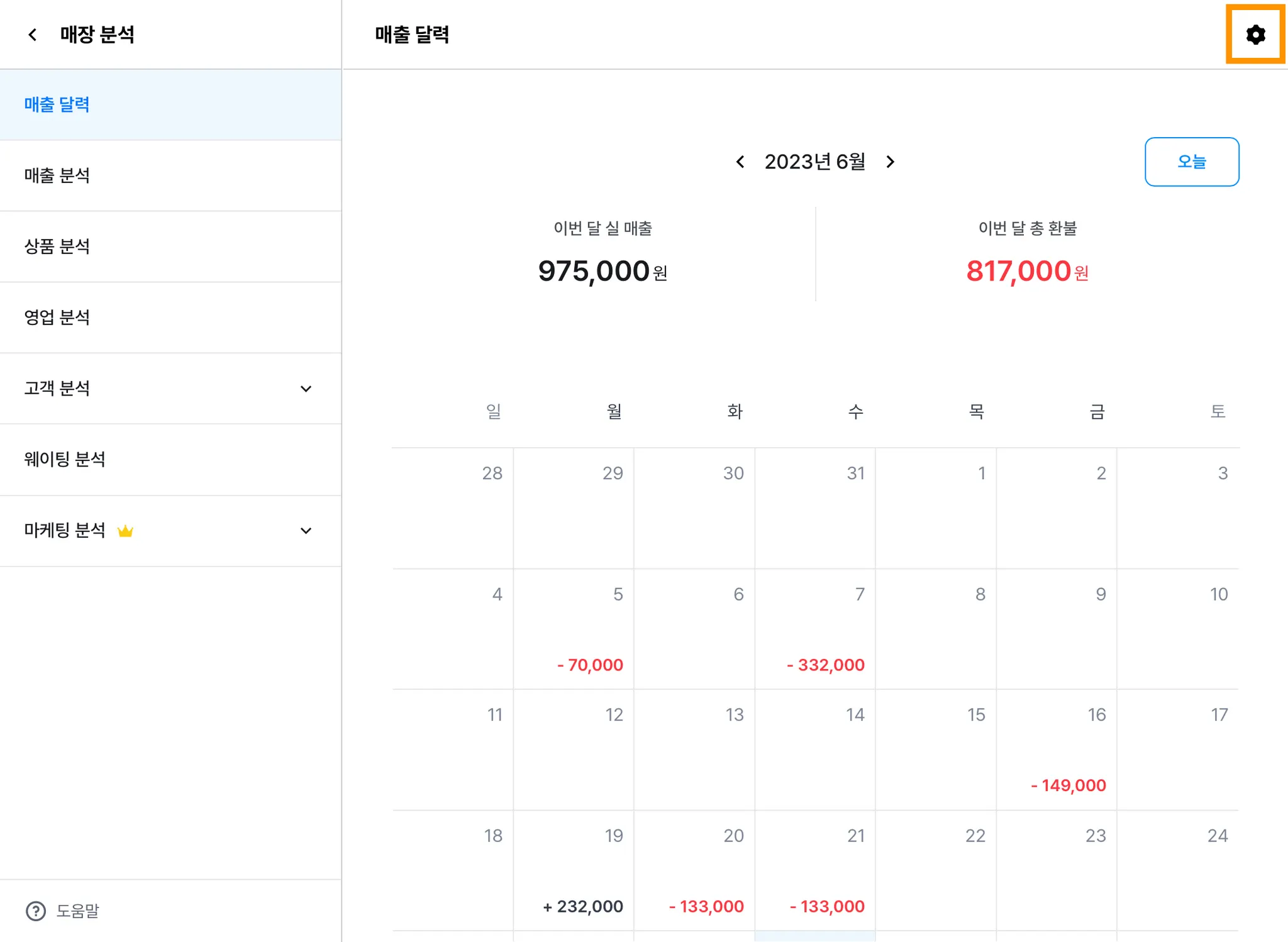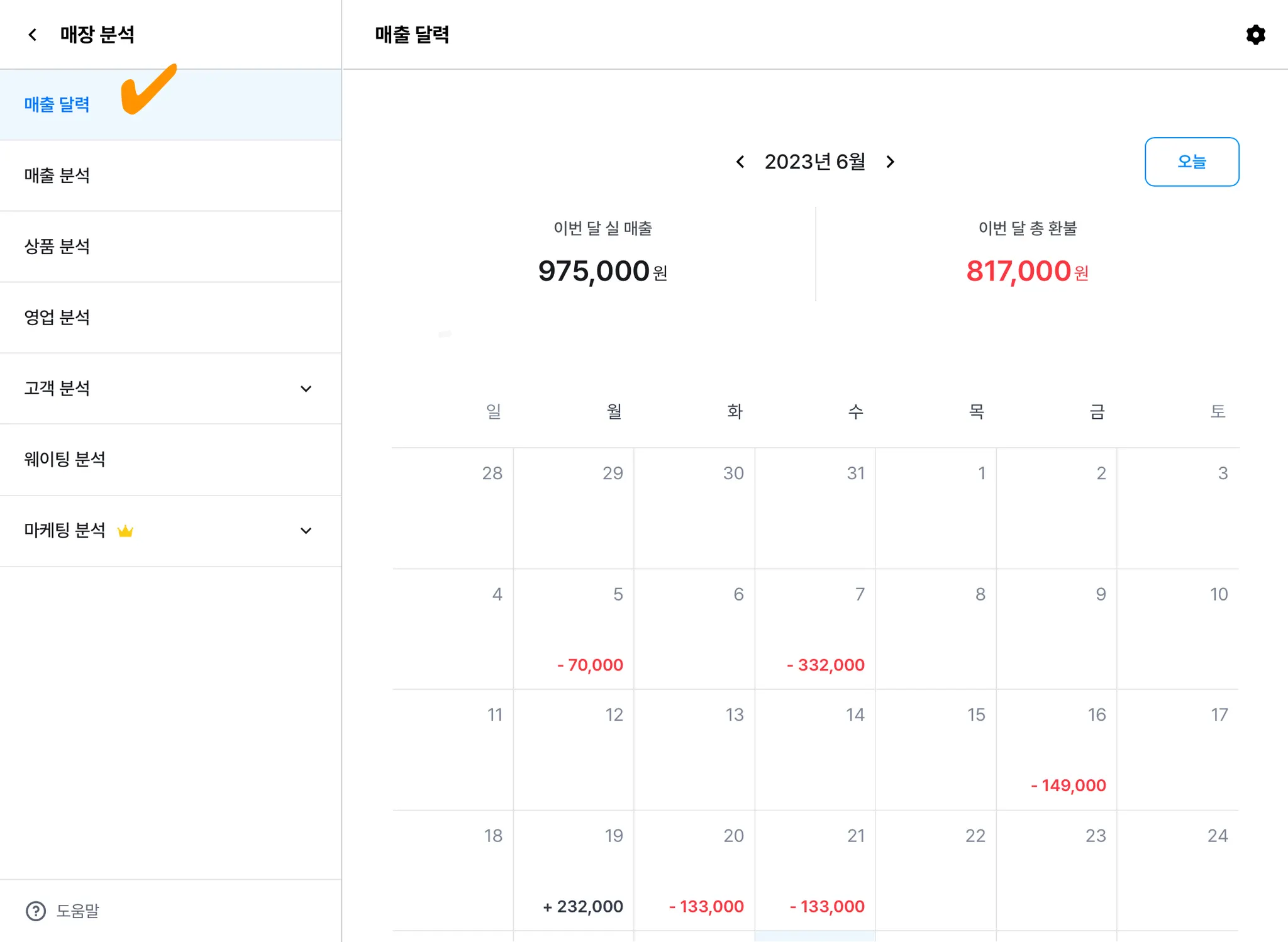1) 매출 달력 항목에서 일일 매출 금액과 환불 금액, 과거 날씨를 달력 형태로 확인할 수 있습니다.