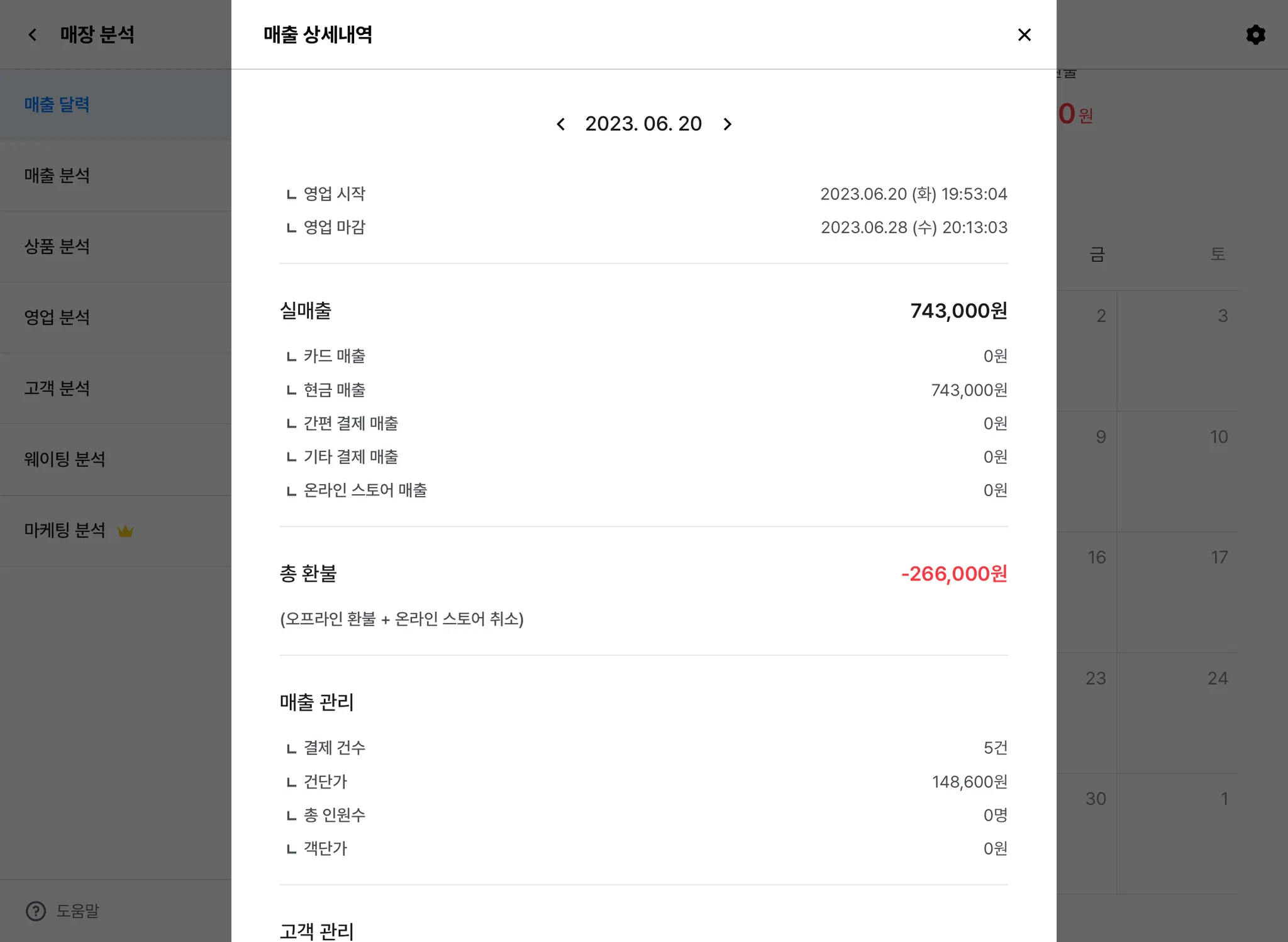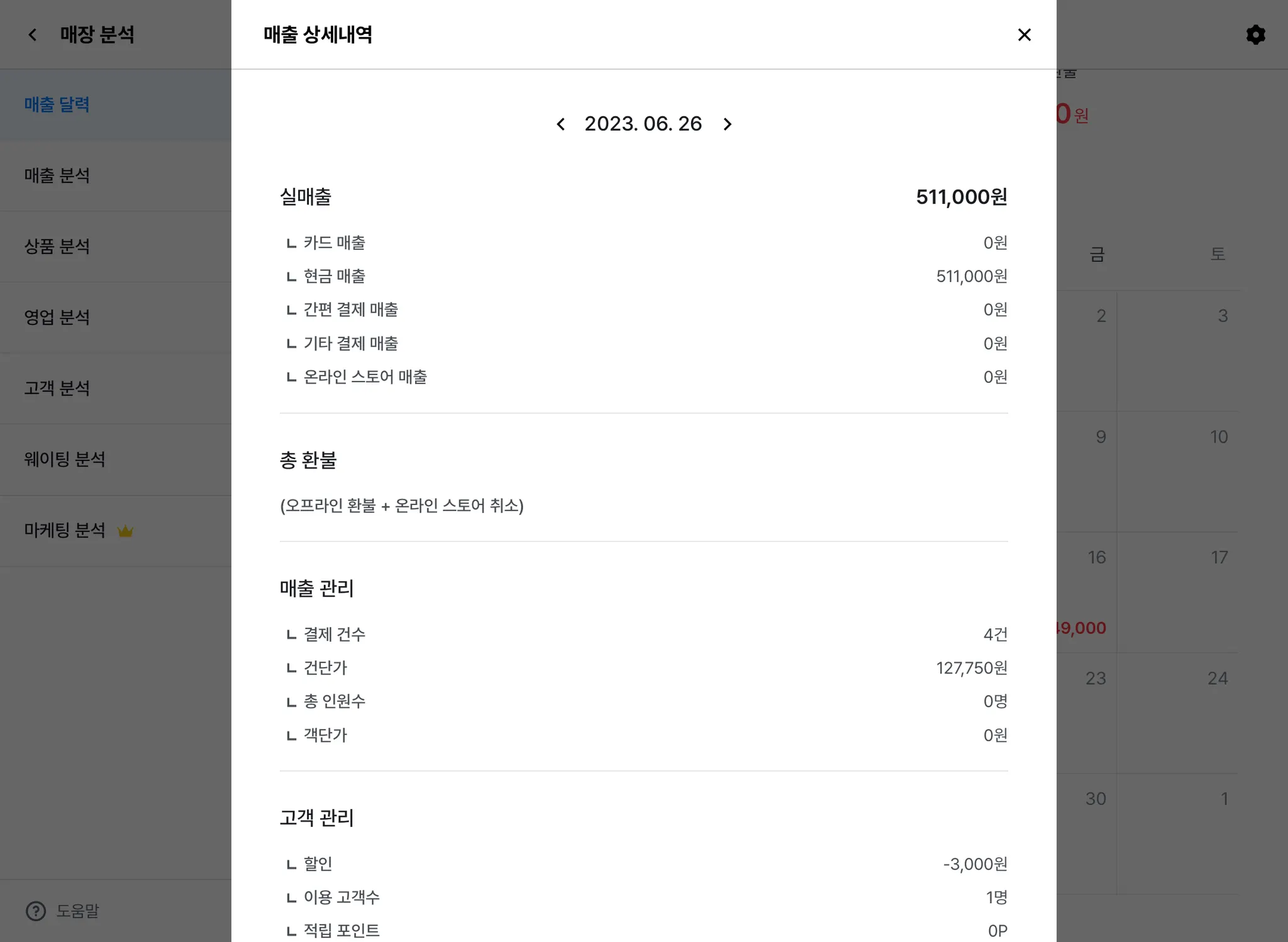 2) 캘린더에서 날짜를 누르면 해당 날짜의 실매출과 총 환불, 매출 관리, 고객 관리를 확인할 수 있습니다.
