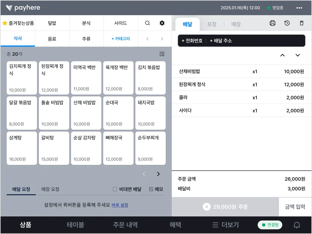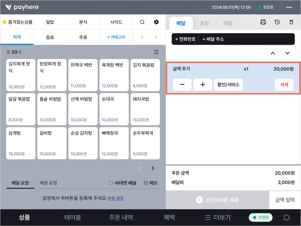 [금액 입력]으로 입력된 ‘금액 추가’ 상품도 주문 목록에 추가됩니다.