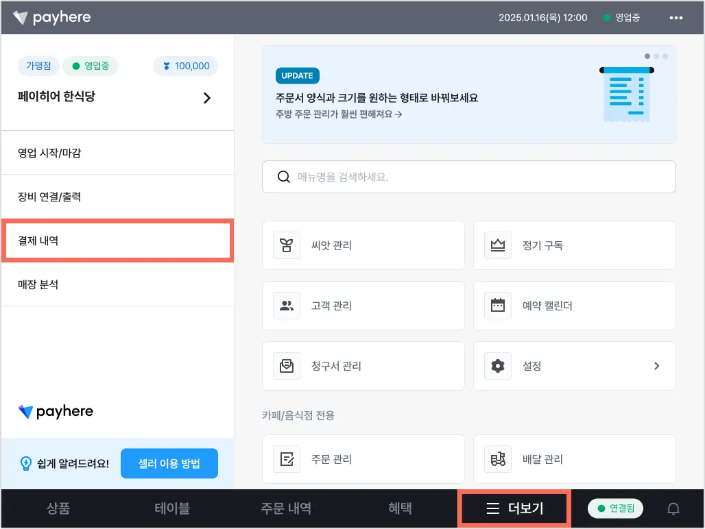 1) [더보기] 탭에서 [결제 내역]을 눌러주세요.