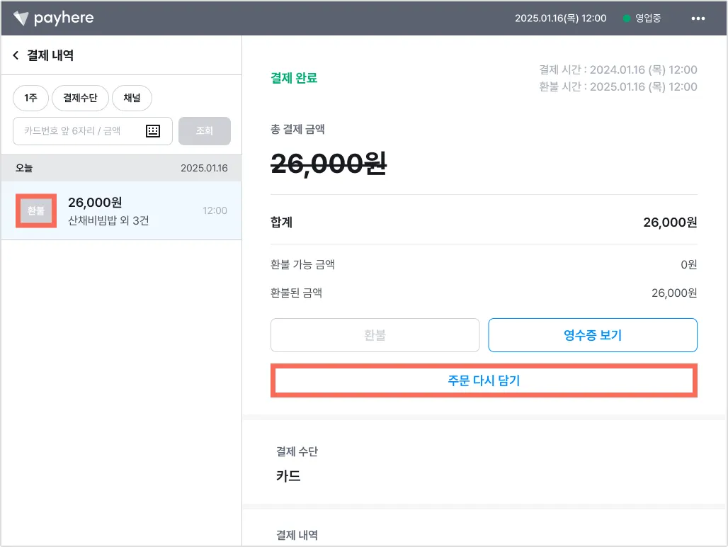 2) ‘환불’된 결제 내역을 선택한 후, [주문 다시 담기]를 눌러주세요.