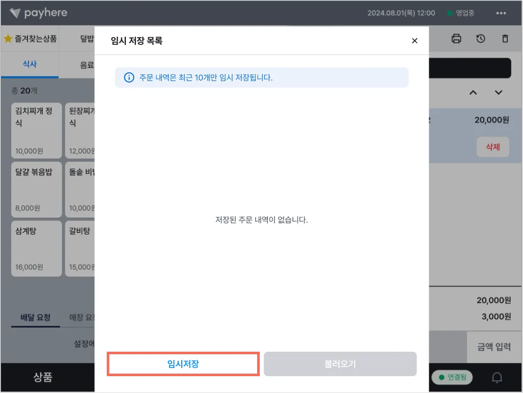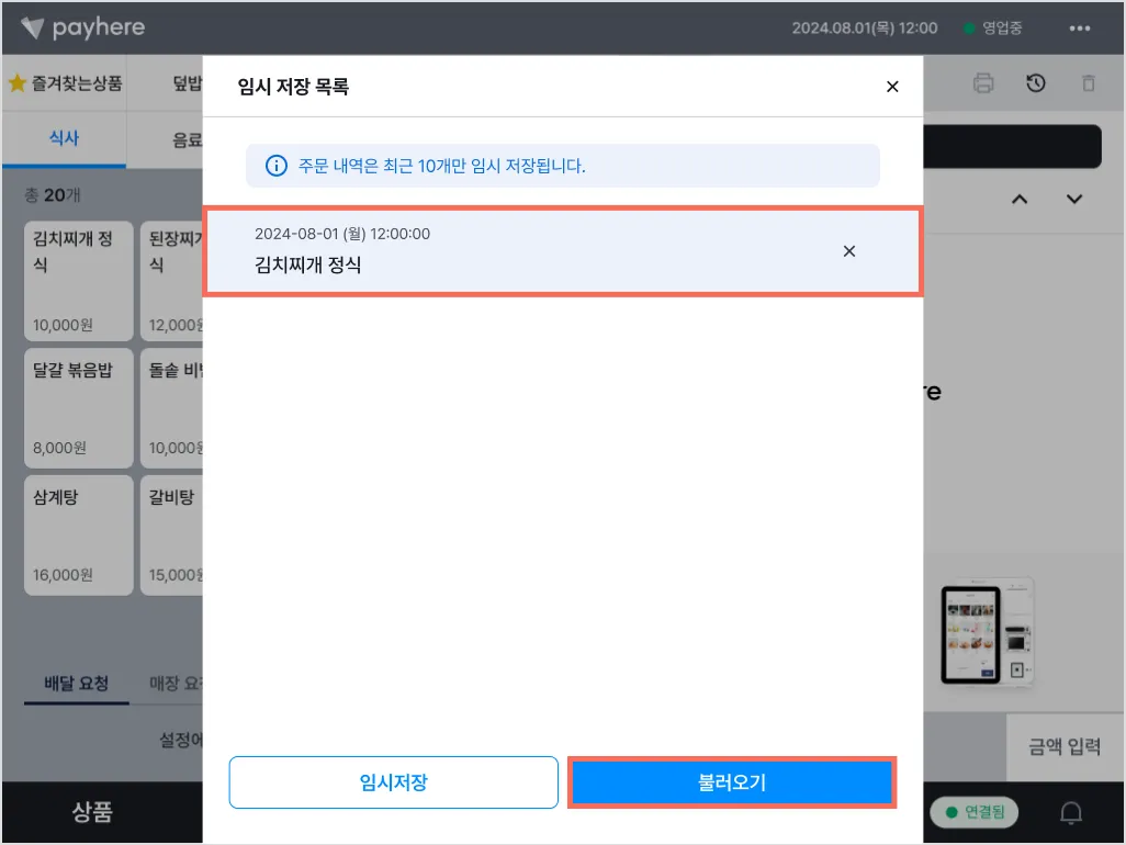 4) 저장된 주문을 불러와야 할 때 다시 [