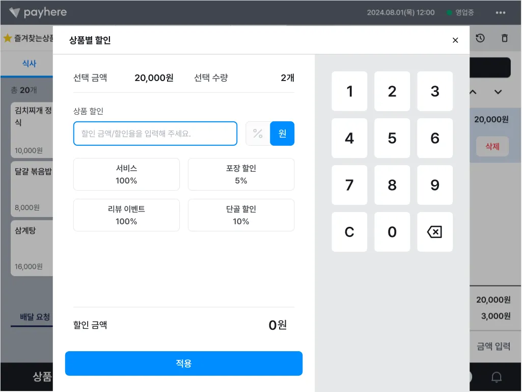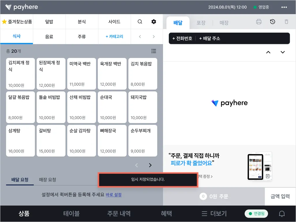 조정된 수량은 물론 할인 · 서비스가 적용된 메뉴도 저장할 수 있어요.