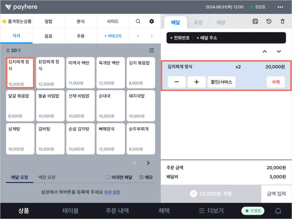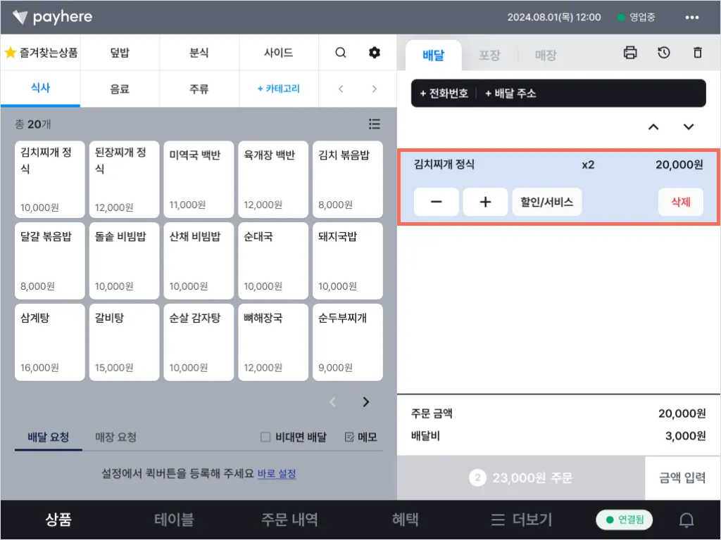 주문 목록에서 메뉴가 선택되면 [-] · [+] · [할인/서비스] · [삭제]가 나타납니다.
