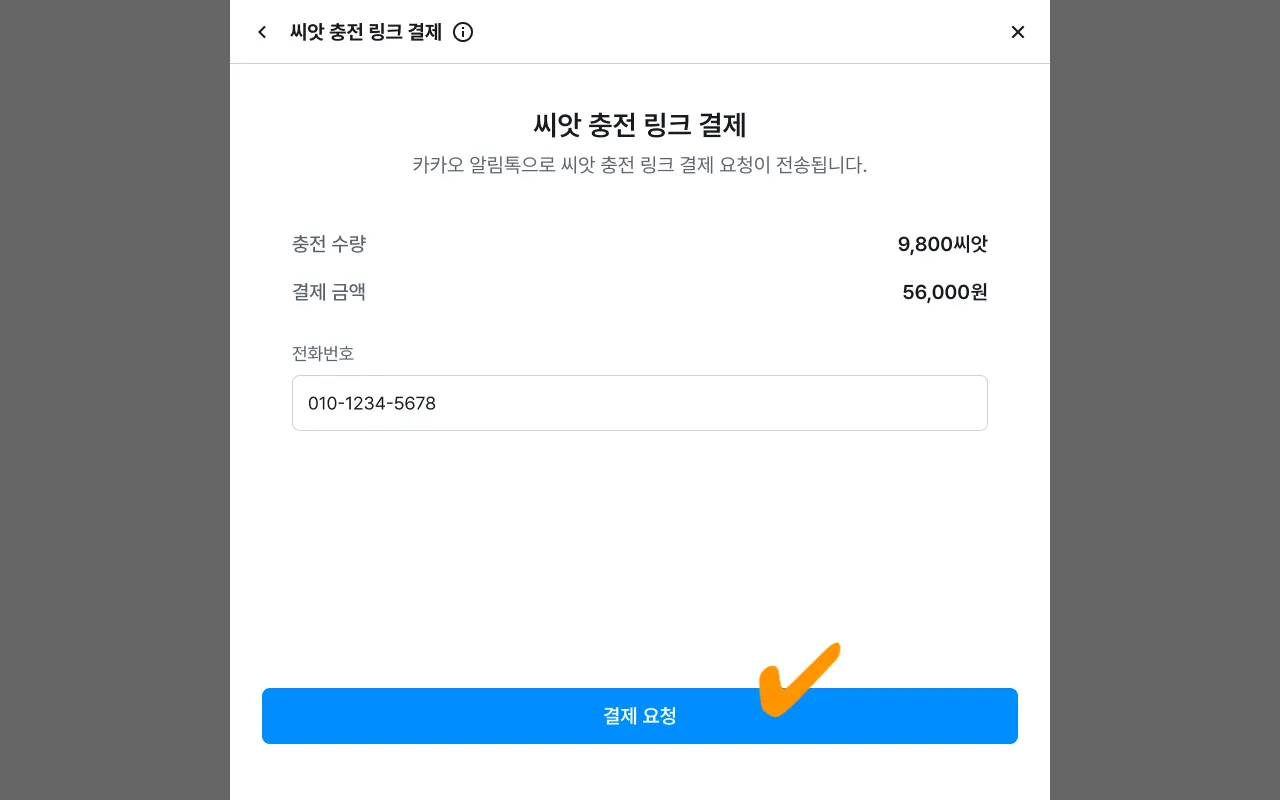 3) 씨앗 결제링크 알림톡을 받을 휴대폰 번호를 입력한 후 [결제 요청]을 눌러주세요.