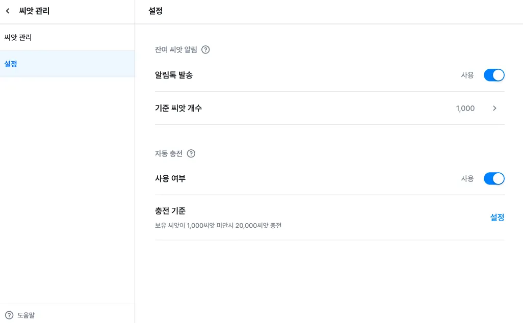 5) 자동 충전 설정 변경은 [더보기] → [씨앗 관리] → [설정] → [자동 충전]에서 설정할 수 있습니다.