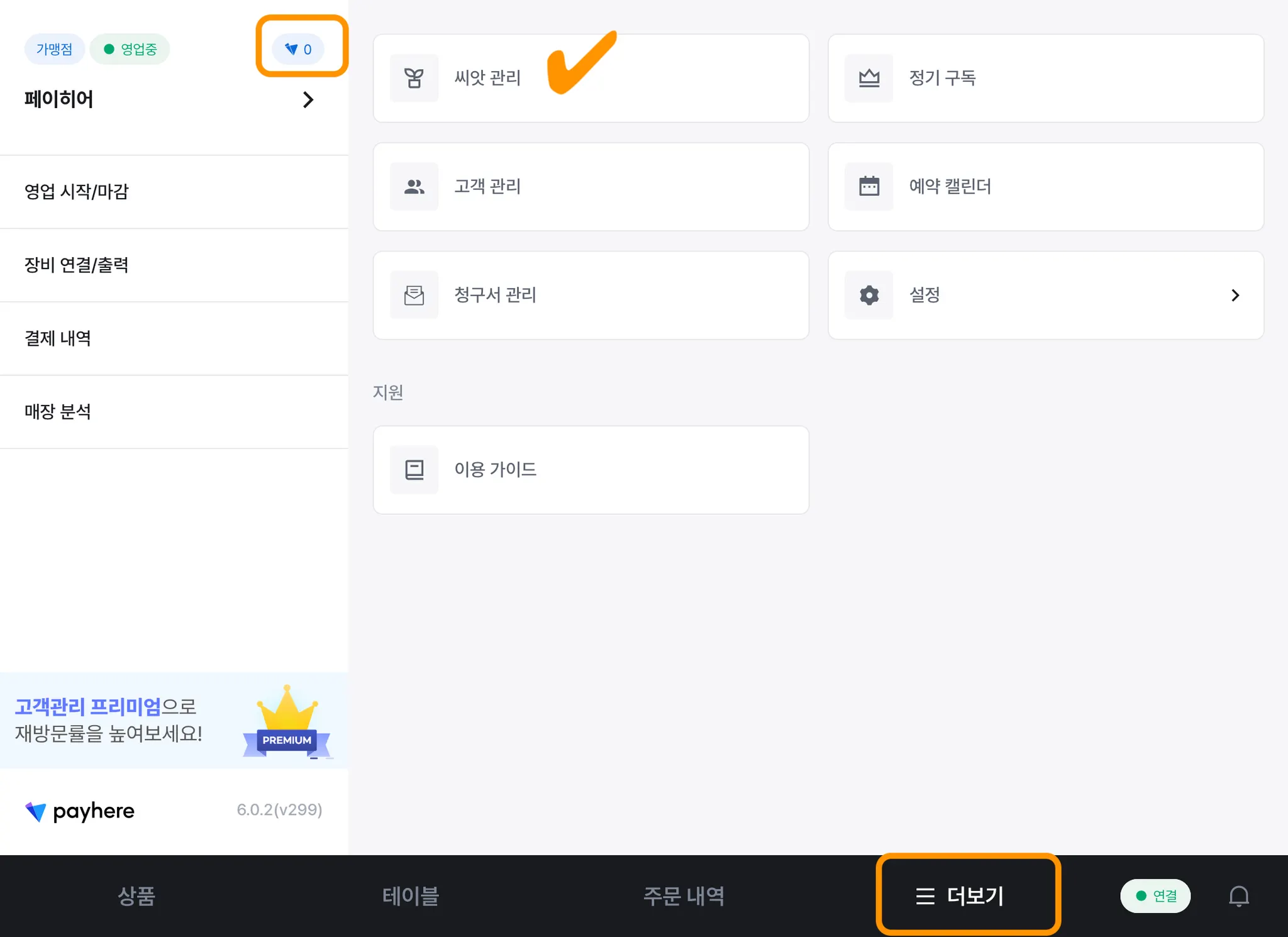 1) [더보기] → [씨앗 관리] 혹은 [보유 씨앗]을 눌러주세요.