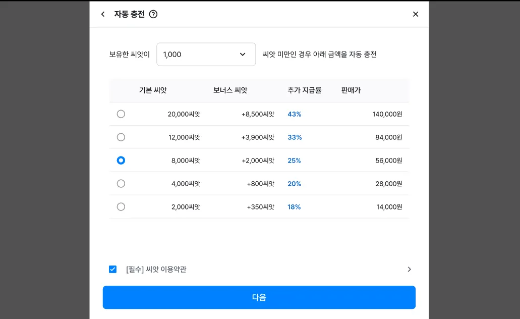 4) 카드 등록이 완료되면 충전 수량을 선택할 수 있습니다. 선택 후 [다음] 버튼을 눌러주세요.