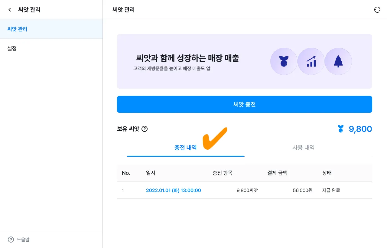 [충전 내역]에선 씨앗 충전 내역을, [사용 내역]에선 씨앗 사용 내역을 확인할 수 있습니다.