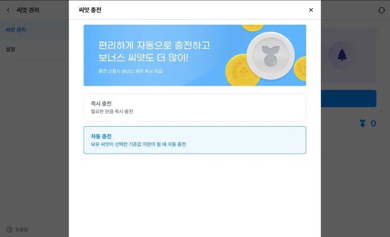 보유 씨앗이 설정한 기준 값 미만이 될 때 자동으로 충전됩니다.