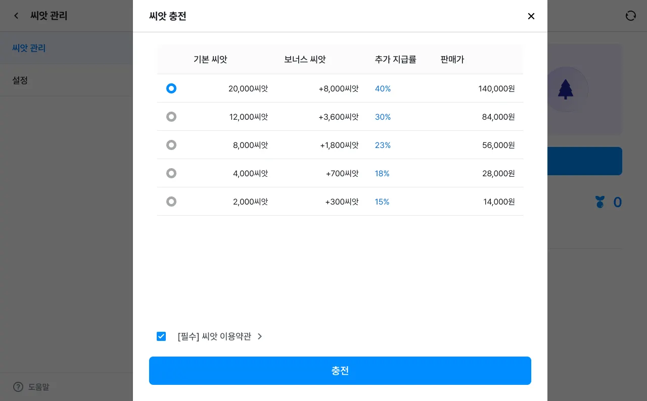 2) 충전할 씨앗을 선택해 [충전] 버튼을 눌러주세요.