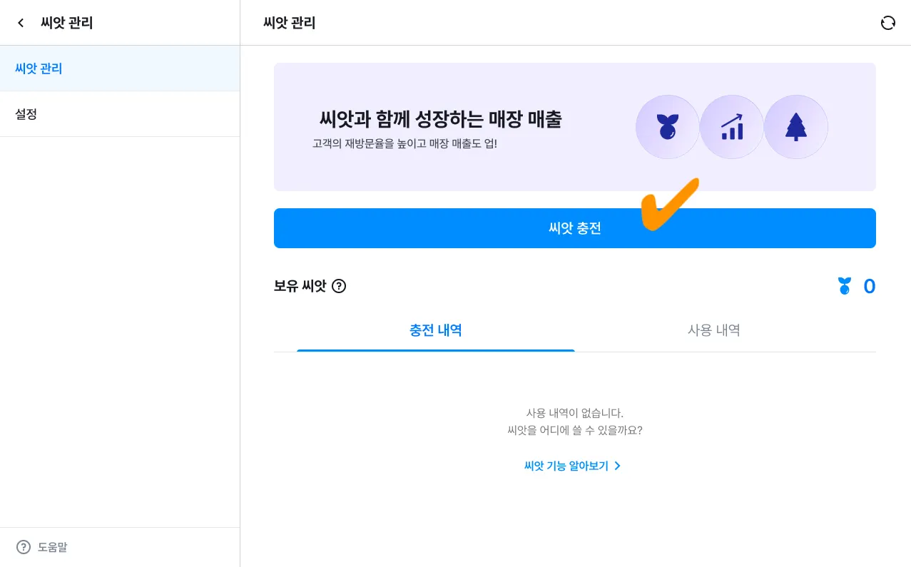 3) [충전] 버튼을 통해 씨앗을 충전하세요.