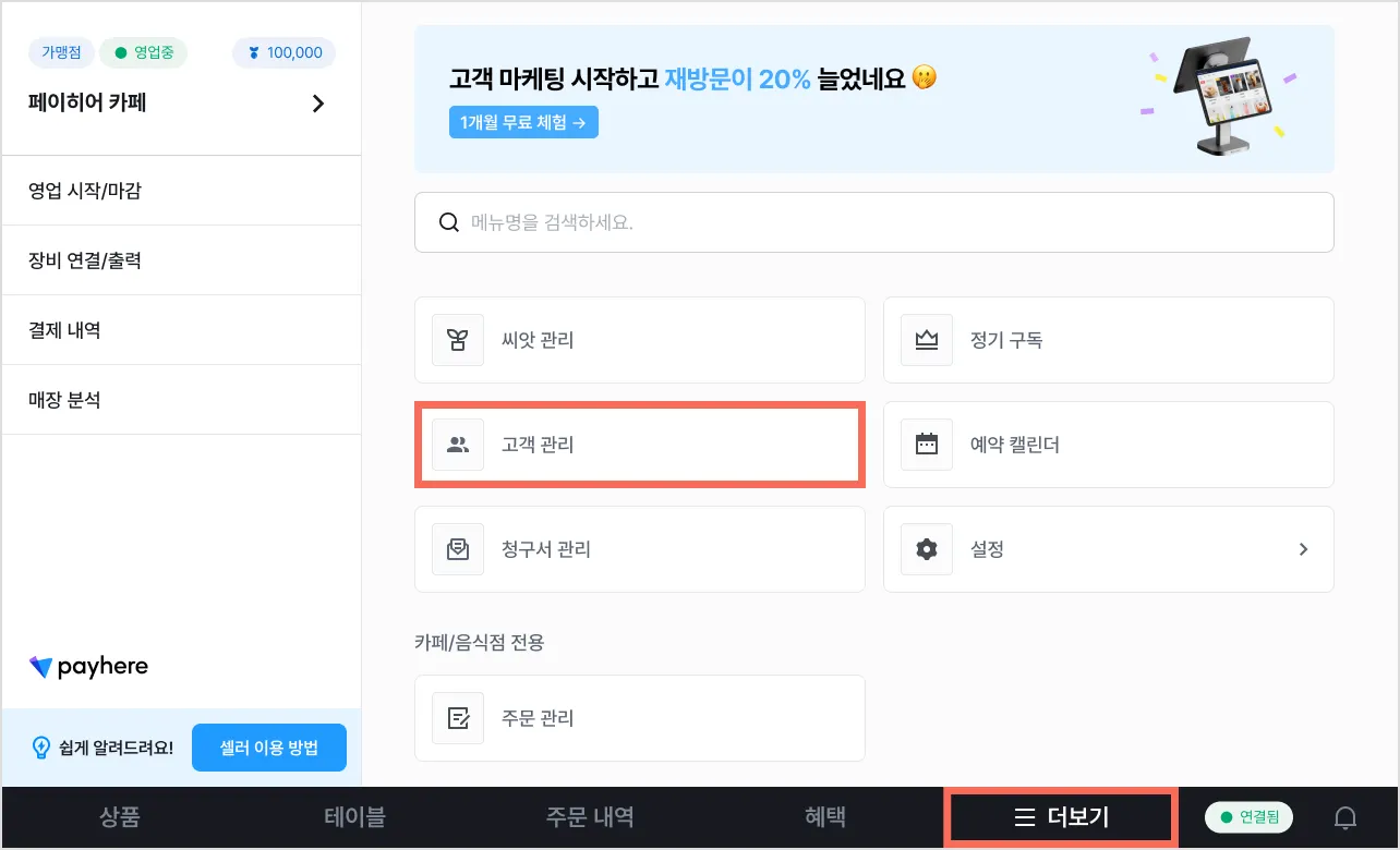 1) [더보기] 탭에서 [고객 관리]를 눌러주세요.