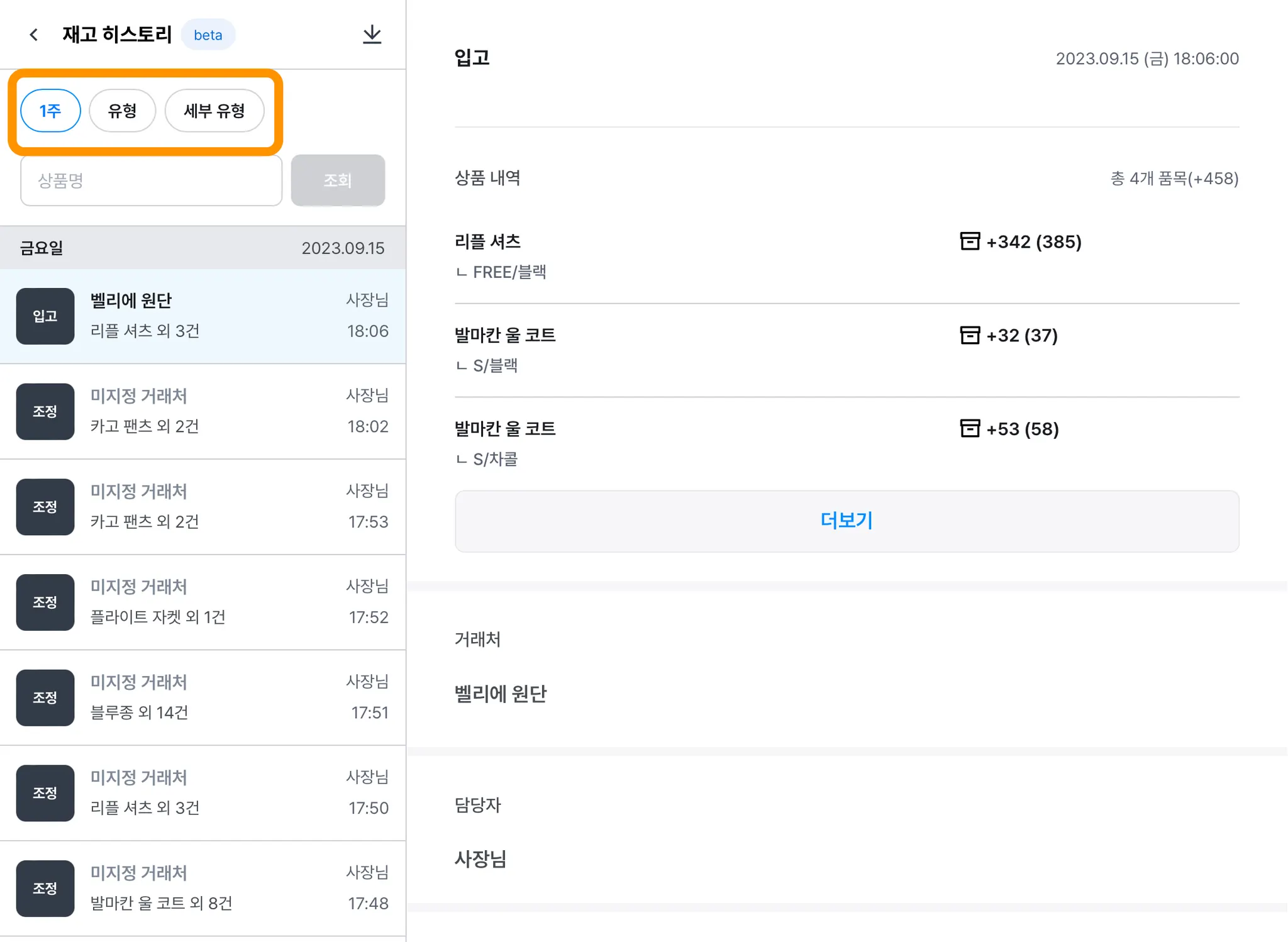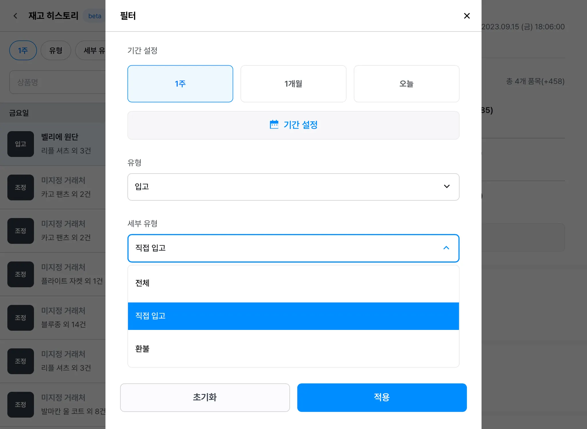 4) 상단의 필터를 통해 재고 히스토리의 세부 유형을 설정할 수 있습니다.