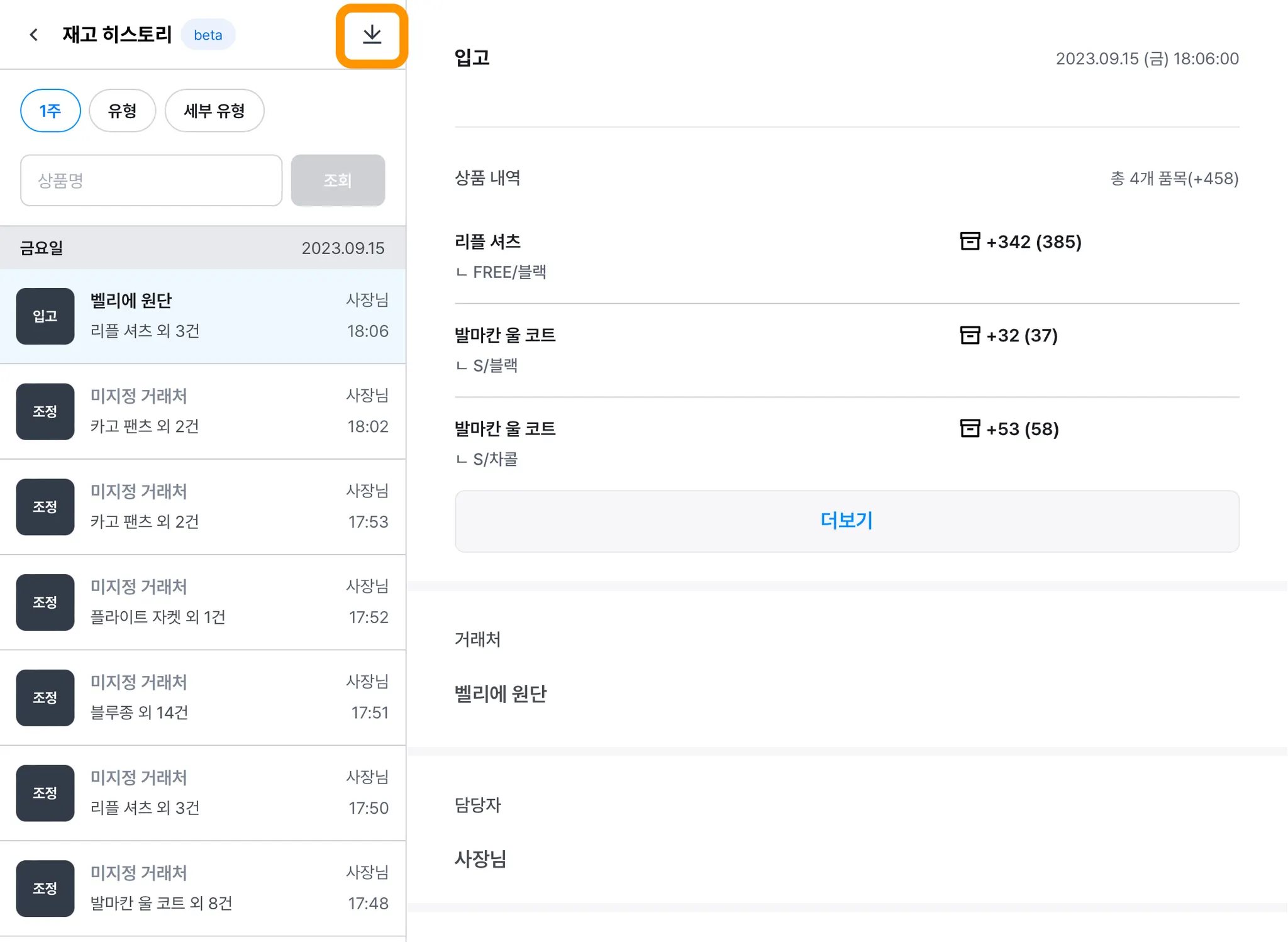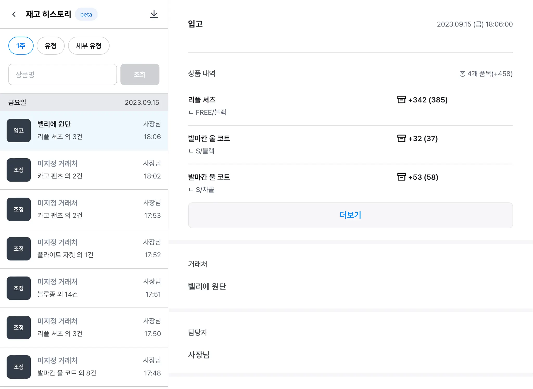 2) 입고, 출고, 조정 내역과 거래처, 담당자 등 재고 히스토리를 확인할 수 있습니다.
