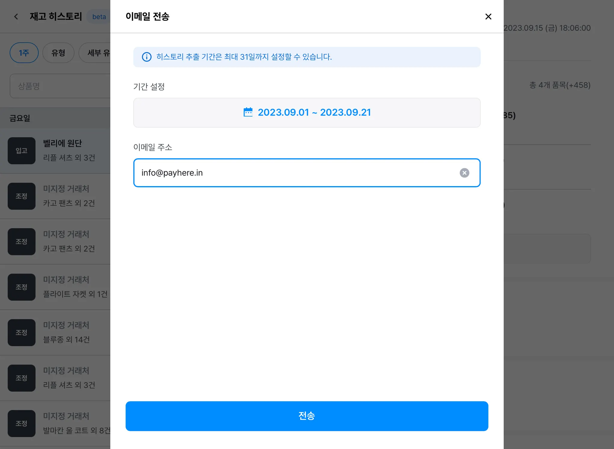 5) 상단의 [다운로드] 아이콘을 누르면 재고 히스토리 내역을 이메일로 받아볼 수 있습니다.