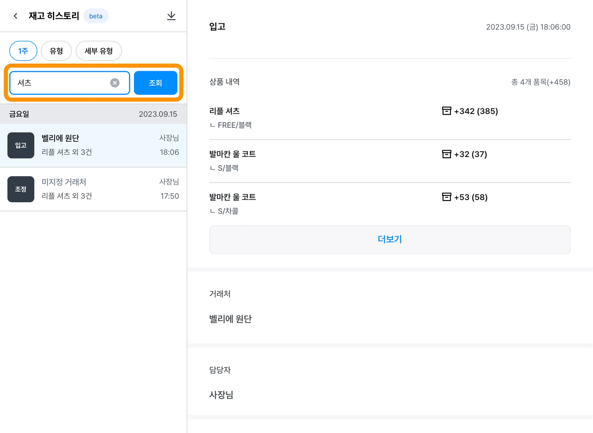 3) 검색창에 상품명을 입력하여 원하는 상품의 재고 히스토리를 찾을 수 있습니다.