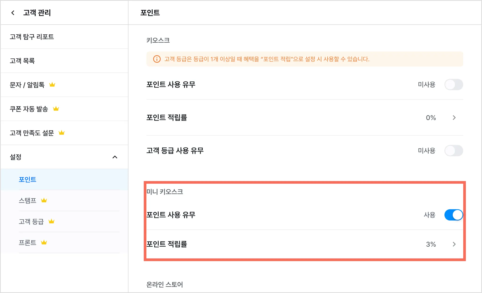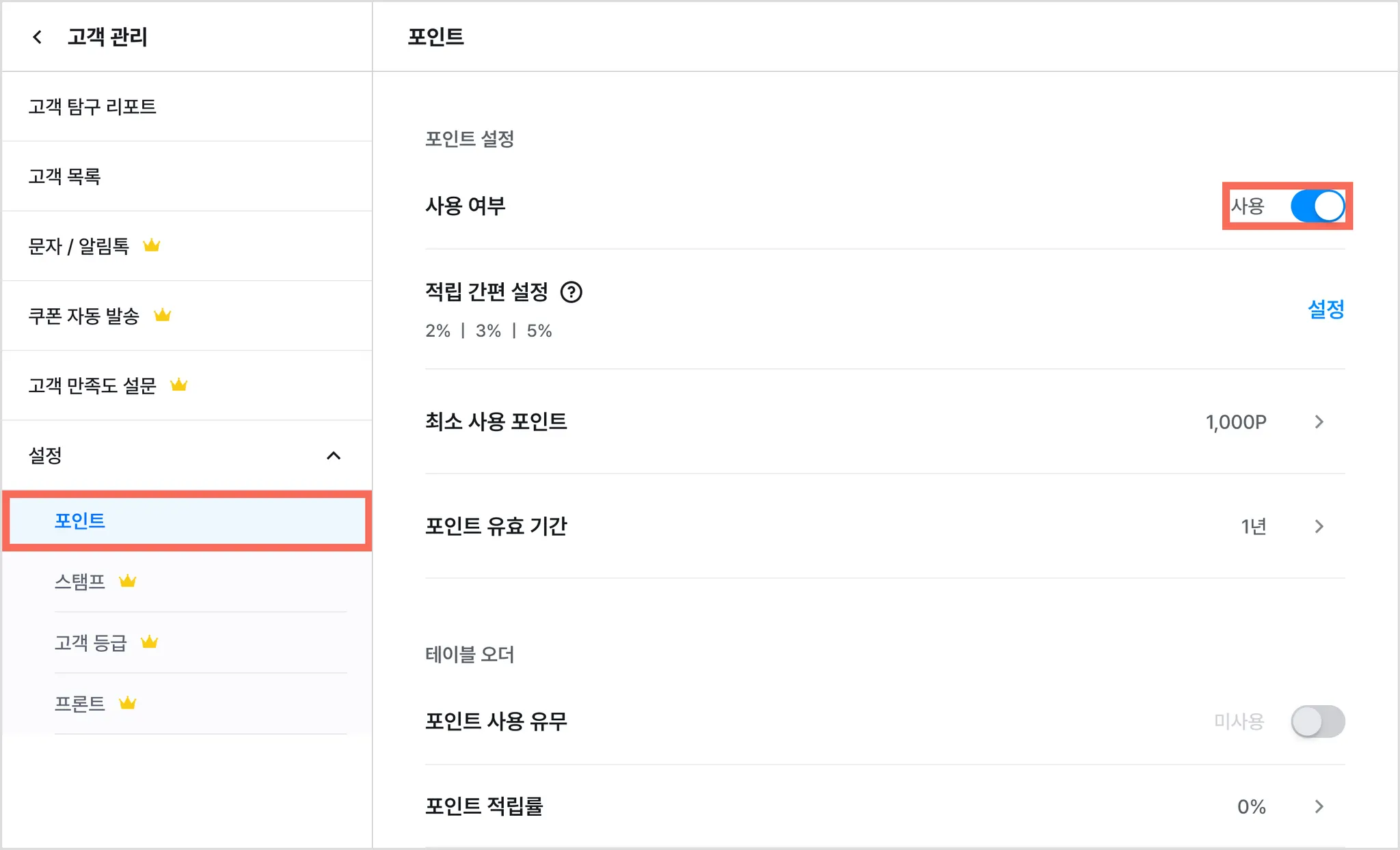 2) [포인트] 또는 [스탬프]를 사용으로 변경해 주세요.