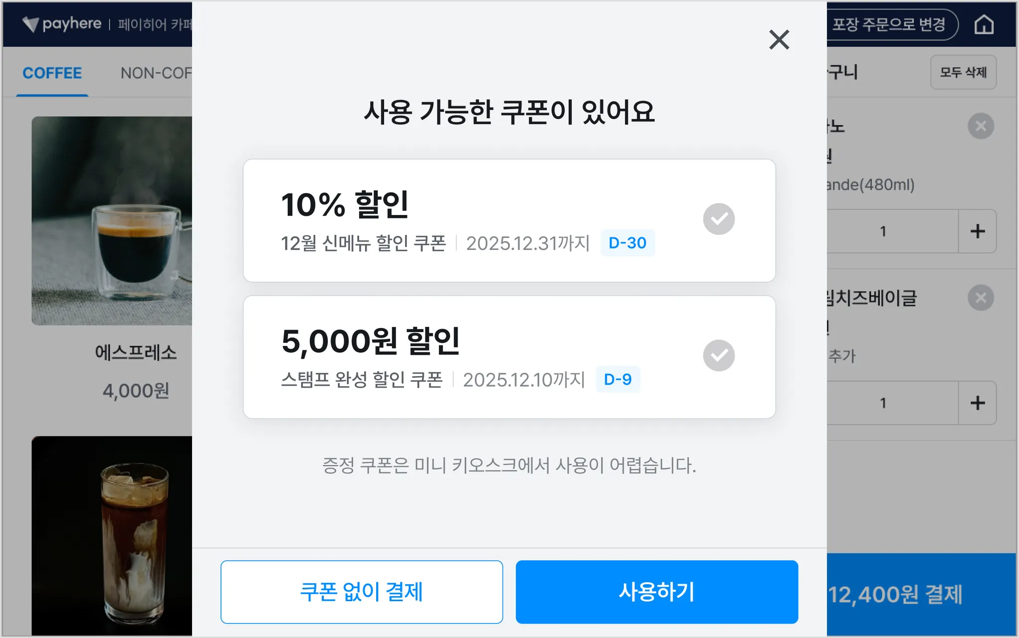 매장 이용 · 포장 주문 모두 선택 : [먹고가기] · [포장하기] 모두 해당 상품이 노출됩니다.