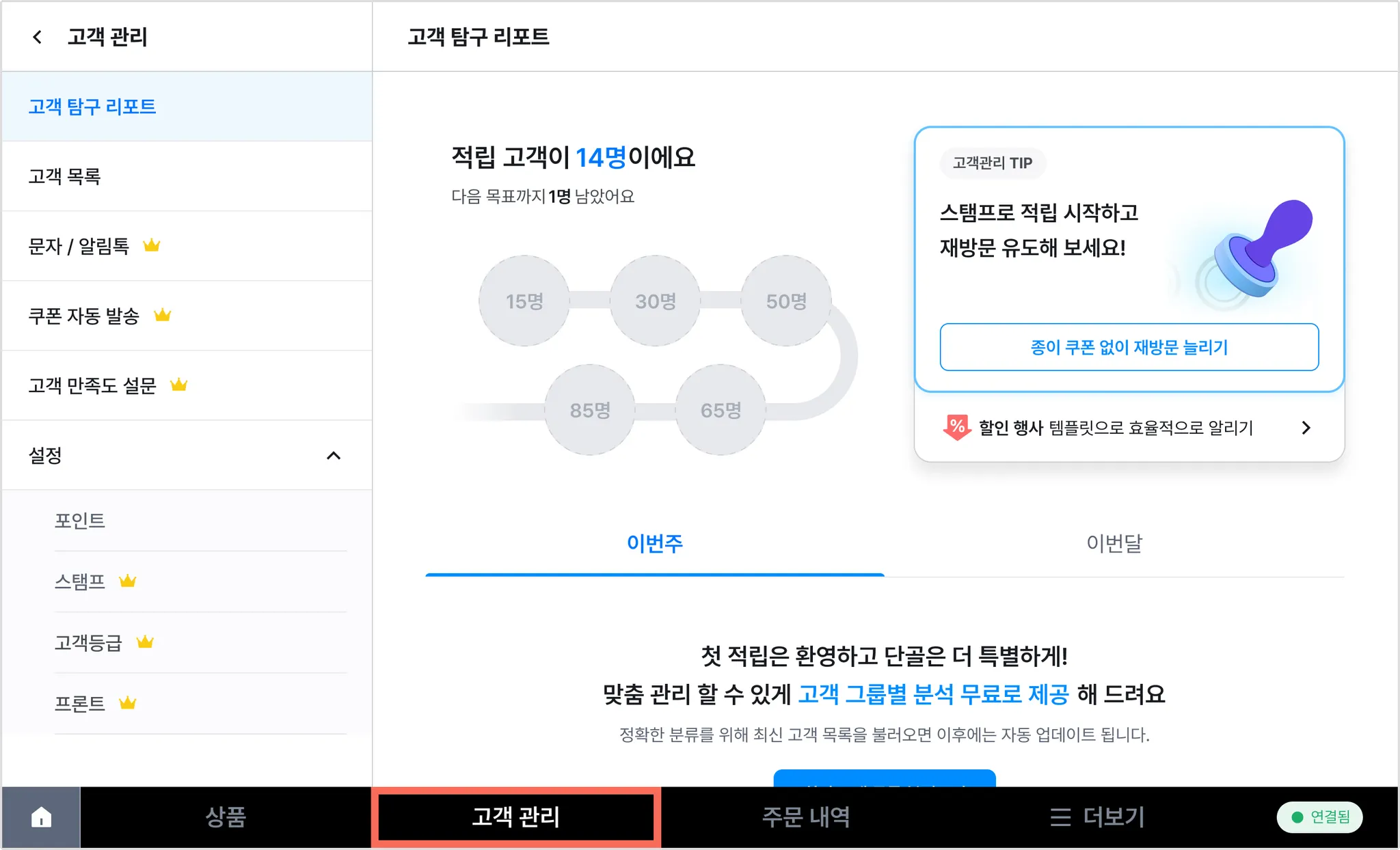 스탬프를 이용하려면 고객 관리 프리미엄 구독이과 최신 버전 사용이 필요해요.