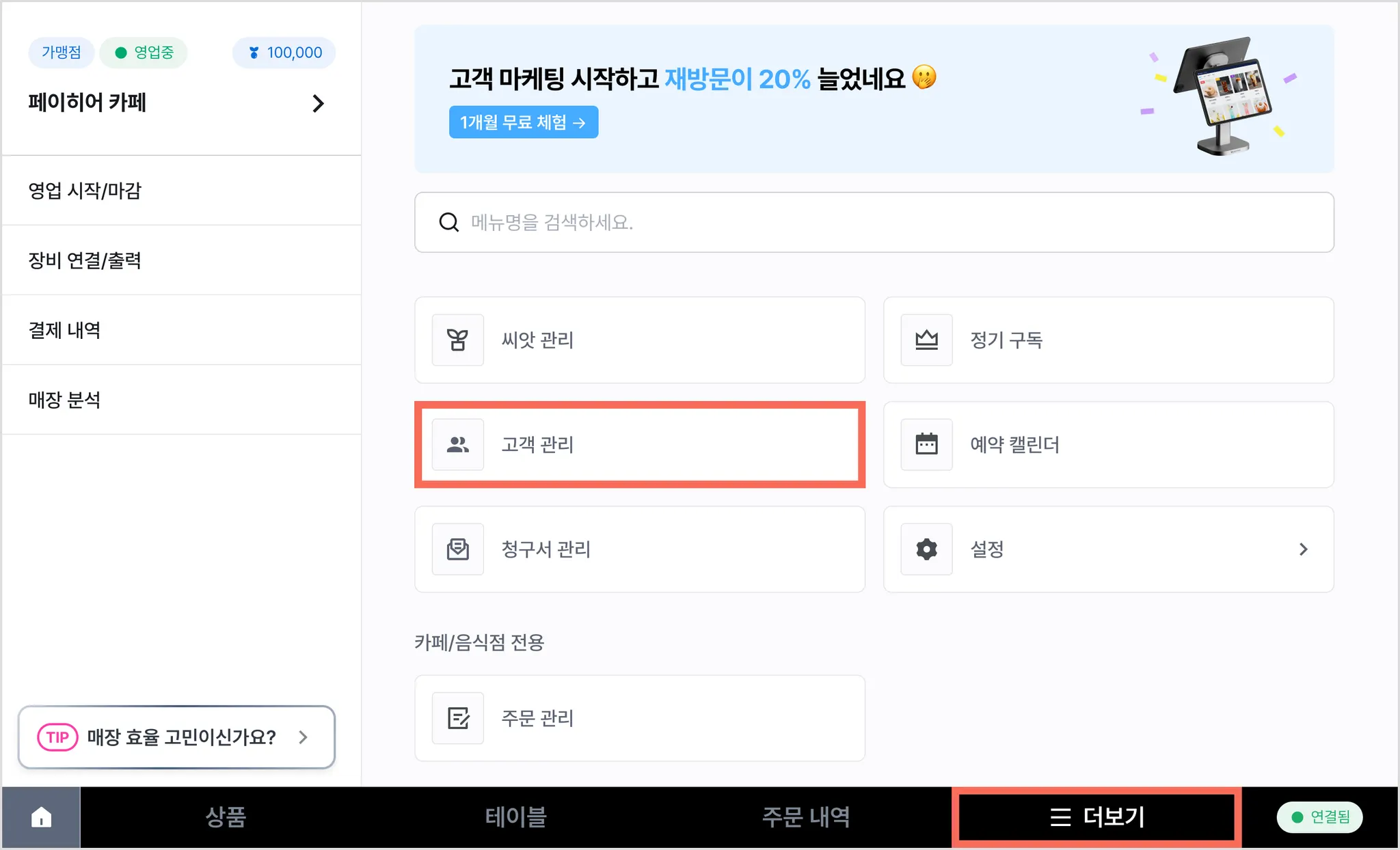 1) [더보기] 탭 → [고객 관리]를 눌러주세요.