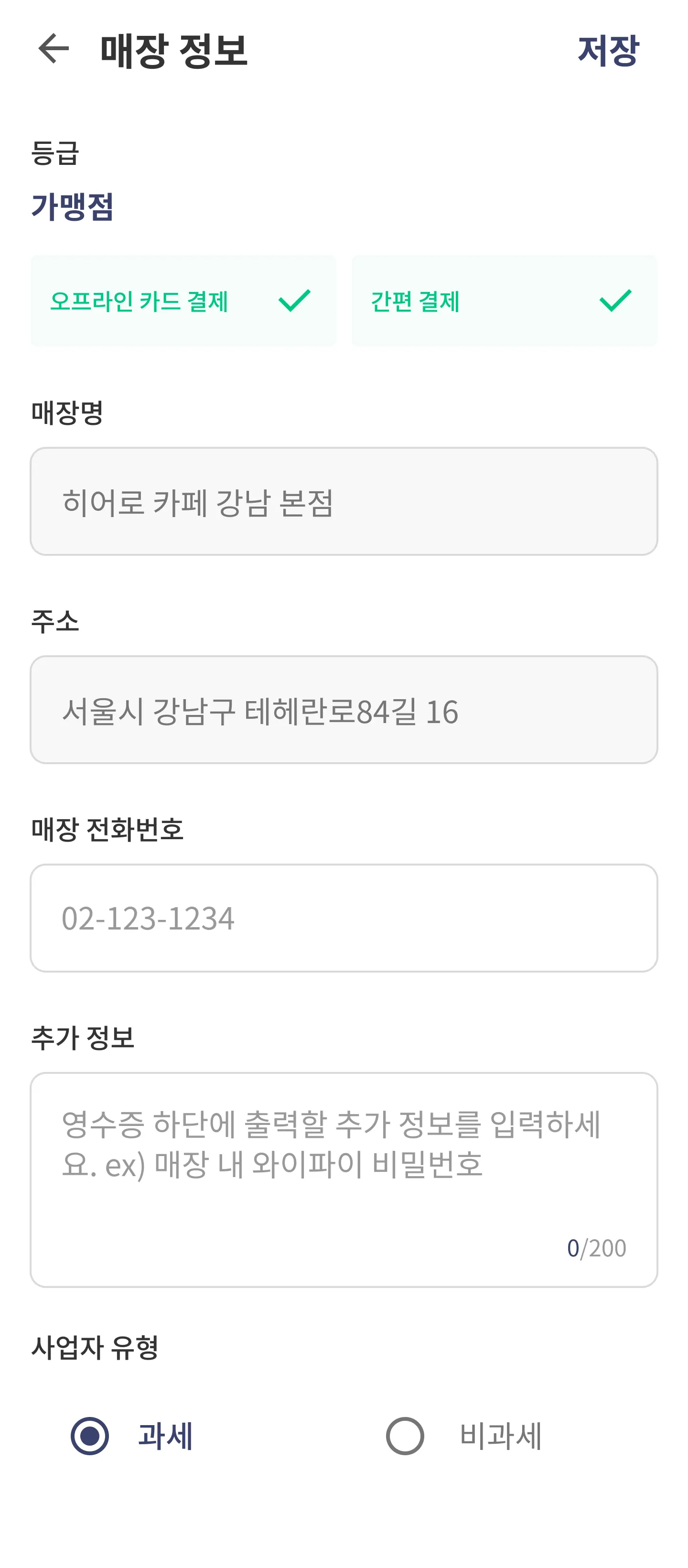 오프라인 카드 결제, 간편 결제 등 가맹 여부를 확인할 수 있습니다.