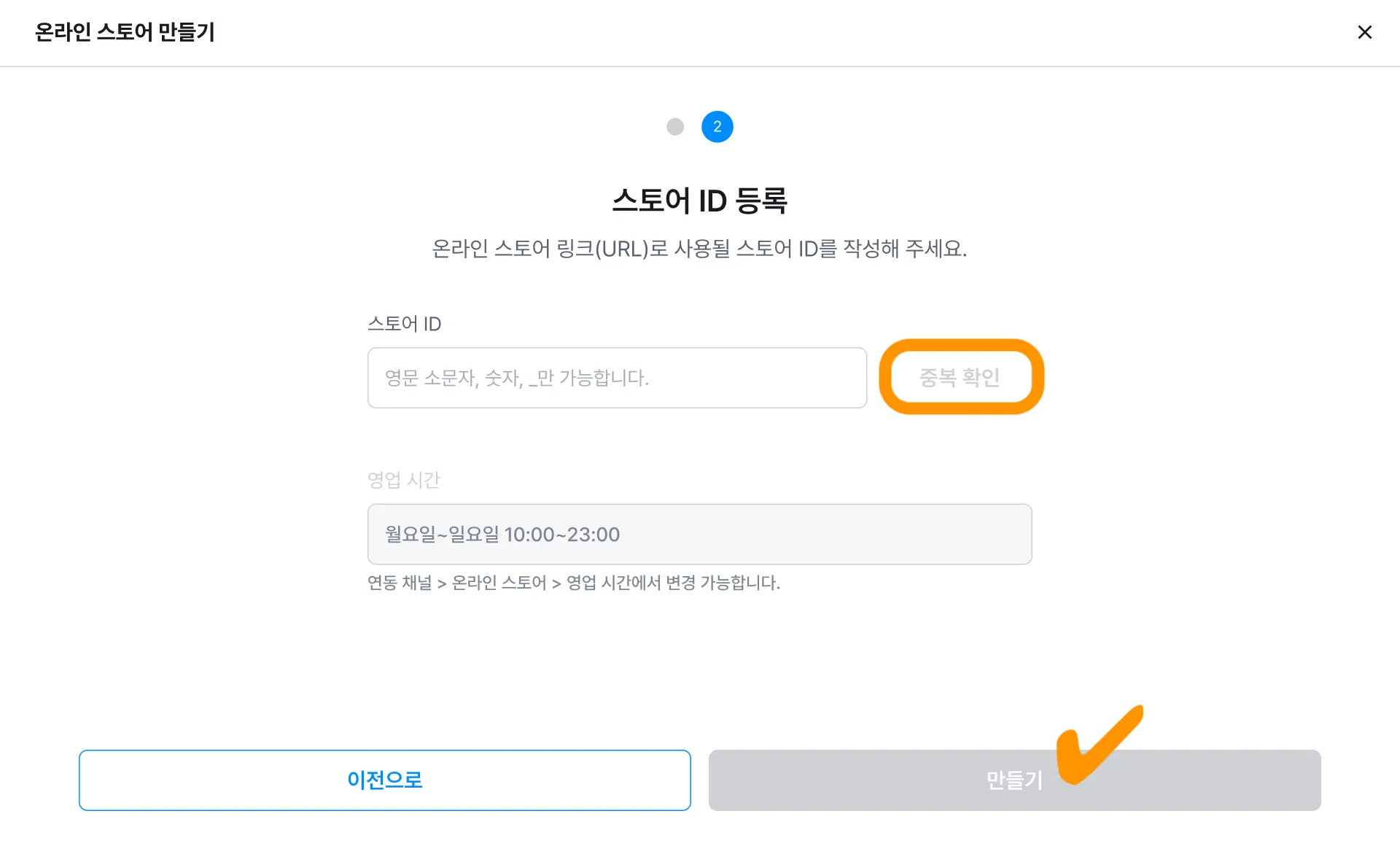 스토어 ID를 입력하고 [중복 확인]한 후 [만들기] 버튼을 눌러주세요.