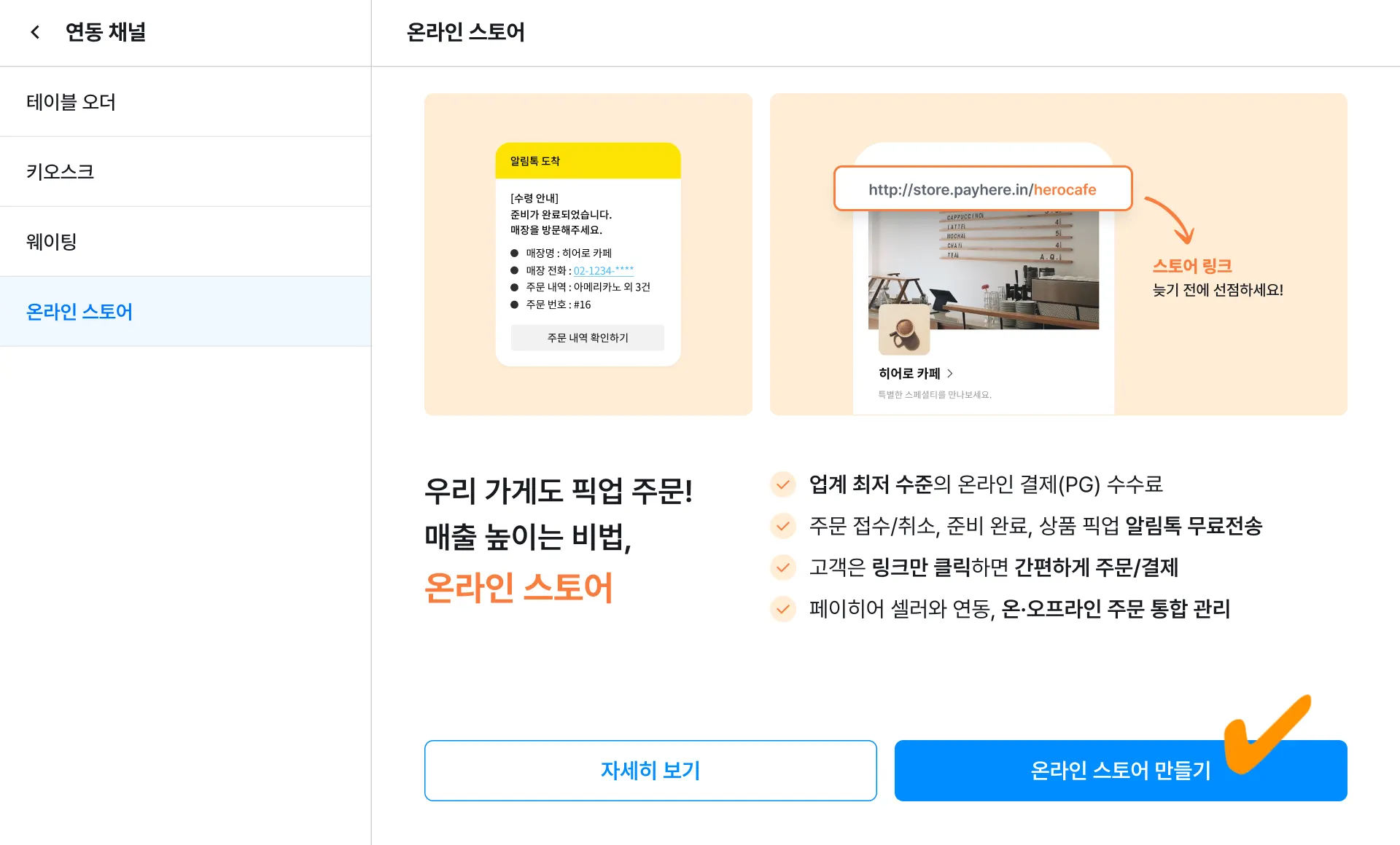 [온라인 스토어] 메뉴 → [온라인 스토어 만들기] 버튼을 눌러주세요.