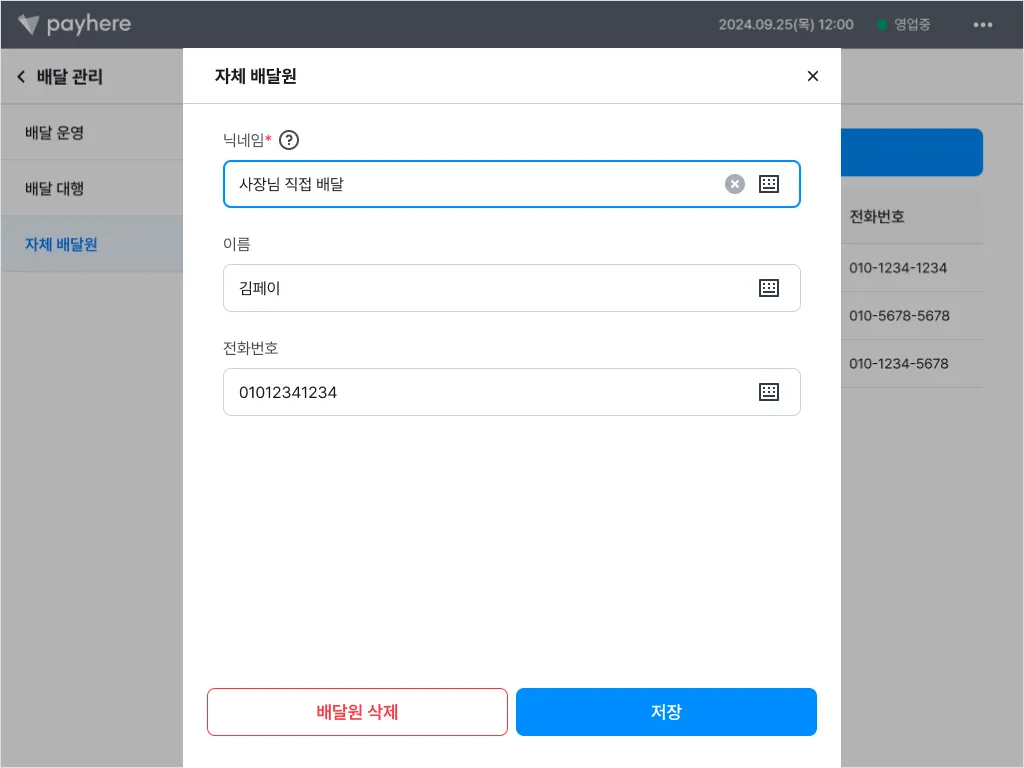 2) 정보 수정 후 [저장]을 누르거나, [배달원 삭제]를 누르면 수정 또는 삭제할 수 있어요.