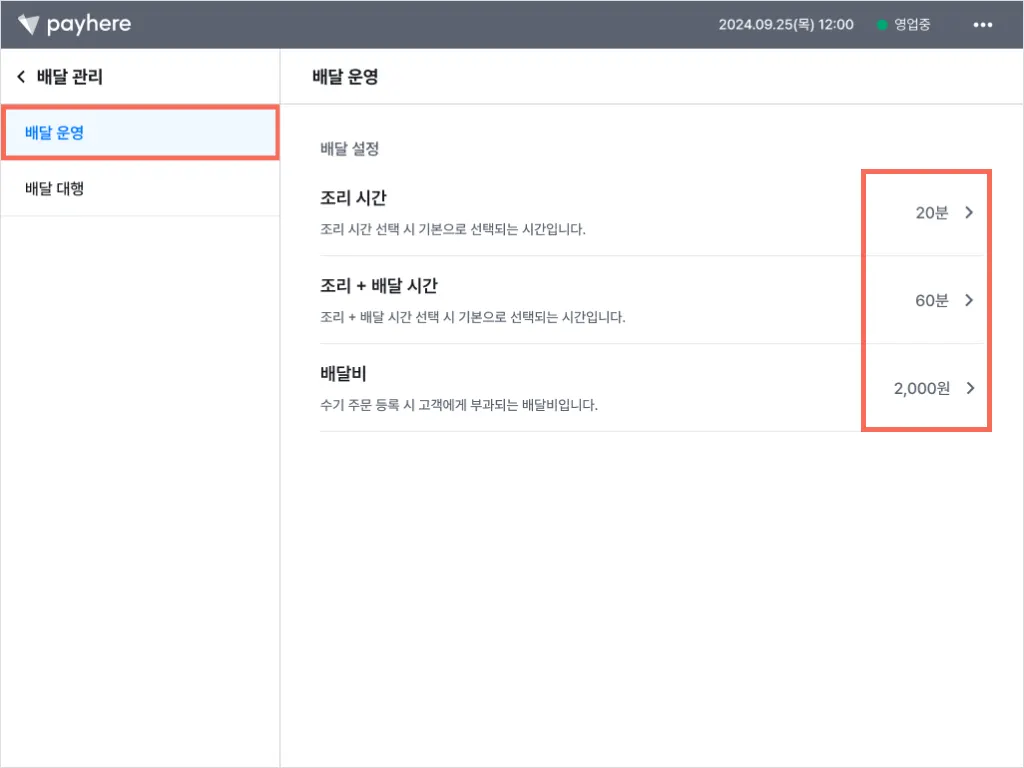 2) [배달 운영]에서 주요 설정이 가능합니다.