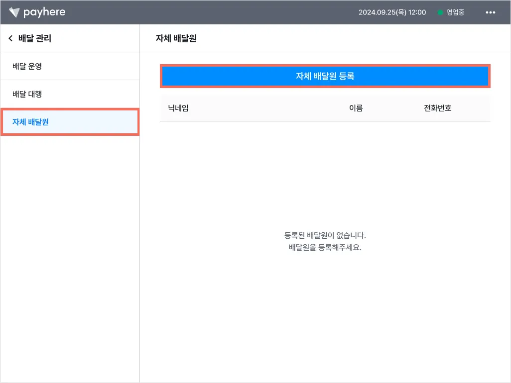 자체 배달원은 최대 3명까지만 등록이 가능해요.