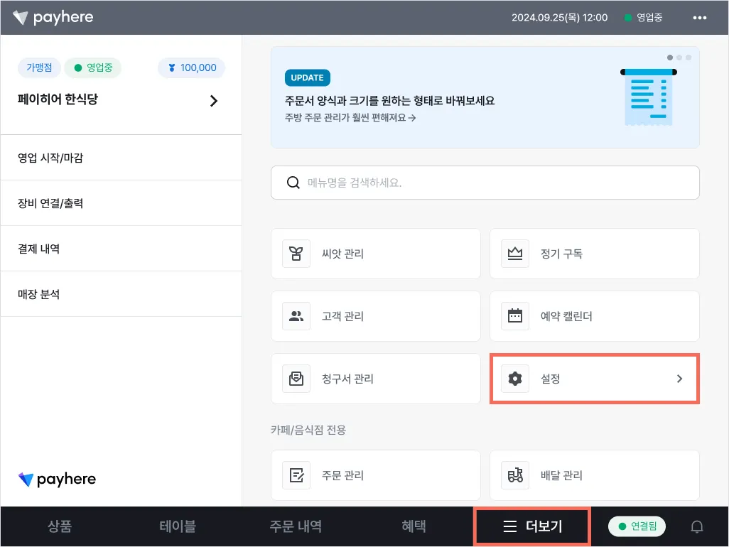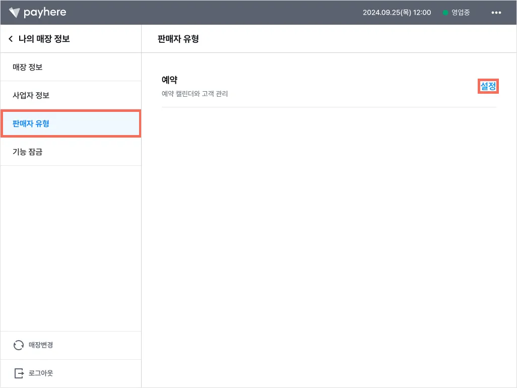 2) [판매자 유형]에서 [설정]을 눌러 카페/음식점 후불 유형으로 변경해 주세요.