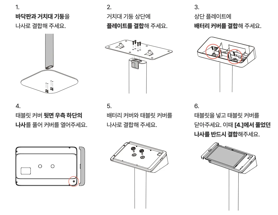 1) 거치대 뒷면에 있는 나사를 풀고, 태블릿을 넣어주세요.