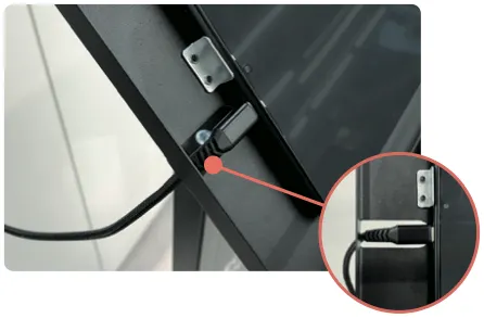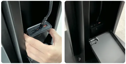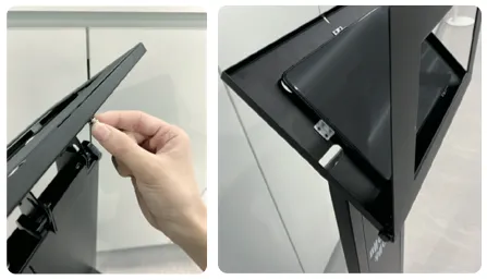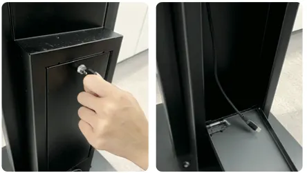 4) 스탠드 뒷면을 열쇠를 꽂아 열고, 충전선 위치를 확인해 주세요.