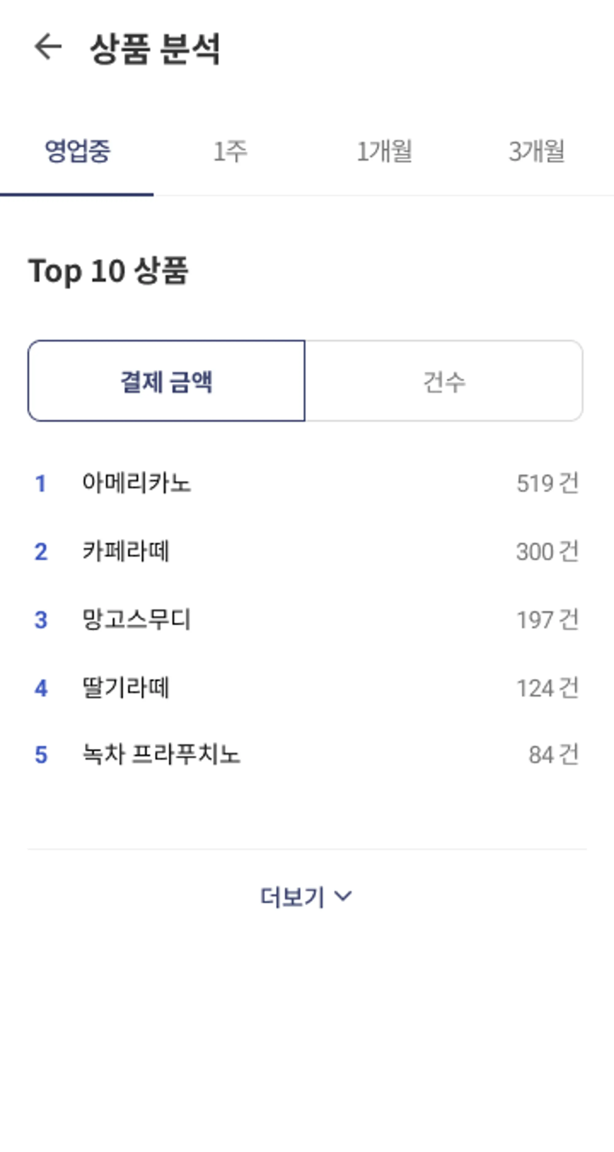 [영업중] · [1주] · [1개월] · [3개월]별로 가장 많이 판매된 Top 10 상품을 확인하실 수 있습니다.