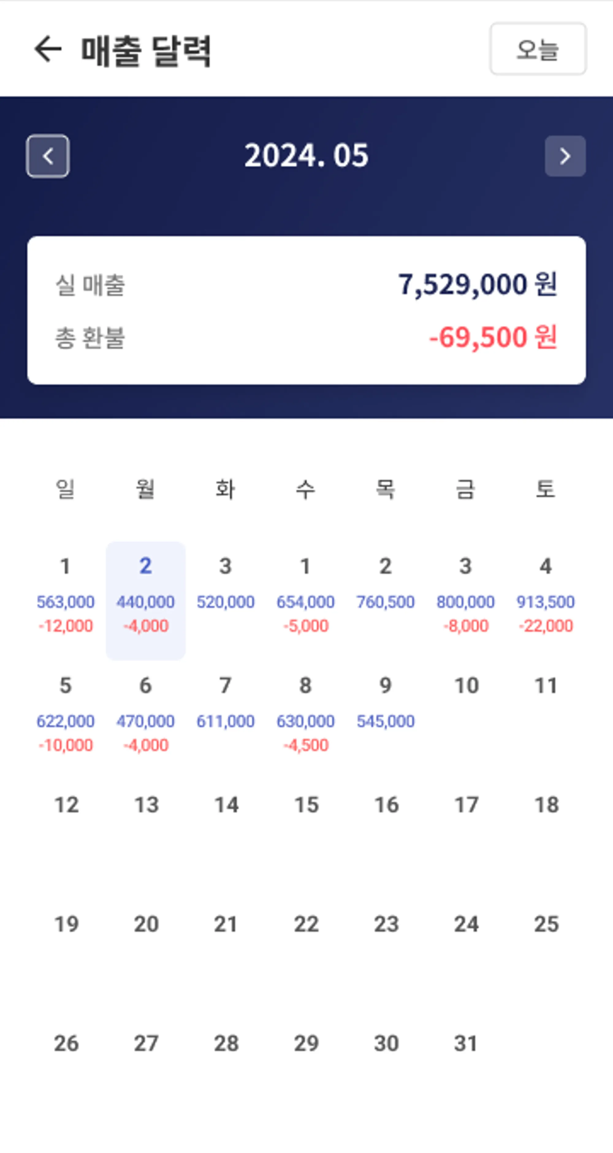 월 별로 실 매출과 총 환불 금액을 한 눈에 확인하실 수 있습니다.