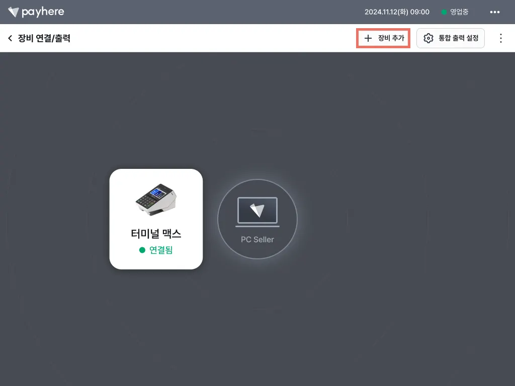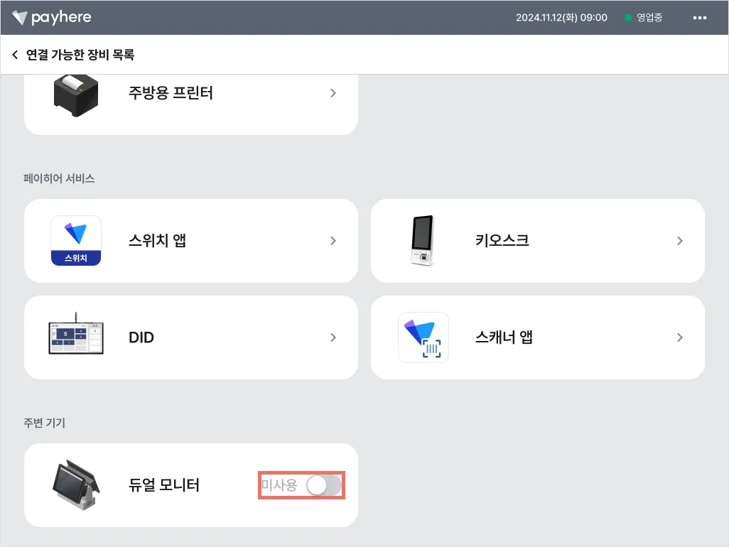 1) 듀얼 모니터 설치를 완료한 후, 페이히어 셀러 내 [더보기] 탭에서 [장비 연결/출력]을 눌러주세요.