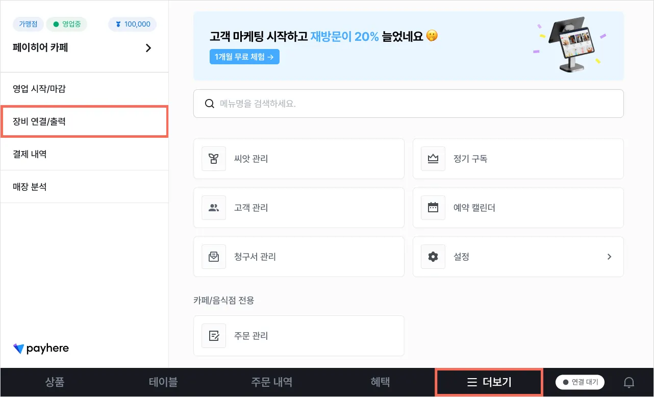 1) [더보기] 탭에서 [장비 연결/출력]을 눌러주세요.